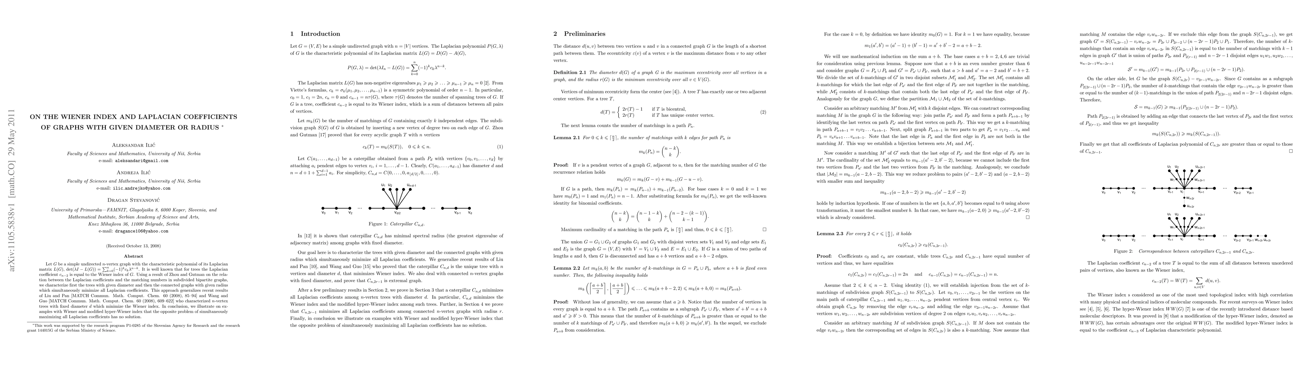 Let $G$ be a simple undirected $n$-vertex graph with the characteristic polynomial of its Laplacian matrix $L(G)$, $\det (\lambda I - L (G))=\sum_{k = 0}^n (-1)^k c_k \lambda^{n - k}$. It is well known that for trees the Laplacian coefficient $c_{n-2}$ is equal to the Wiener index of $G$. Using a result of Zhou and Gutman on the relation between the Laplacian coefficients and the matching numbers in subdivided bipartite graphs, we characterize first the trees with given diameter and then the connected graphs with given radius which simultaneously minimize all Laplacian coefficients. This approach generalizes recent results of Liu and Pan [MATCH Commun. Math. Comput. Chem. 60 (2008), 85--94] and Wang and Guo [MATCH Commun. Math. Comput. Chem. 60 (2008), 609--622] who characterized $n$-vertex trees with fixed diameter $d$ which minimize the Wiener index. In conclusion, we illustrate on examples with Wiener and modified hyper-Wiener index that the opposite problem of simultaneously maximizing all Laplacian coefficients has no solution.