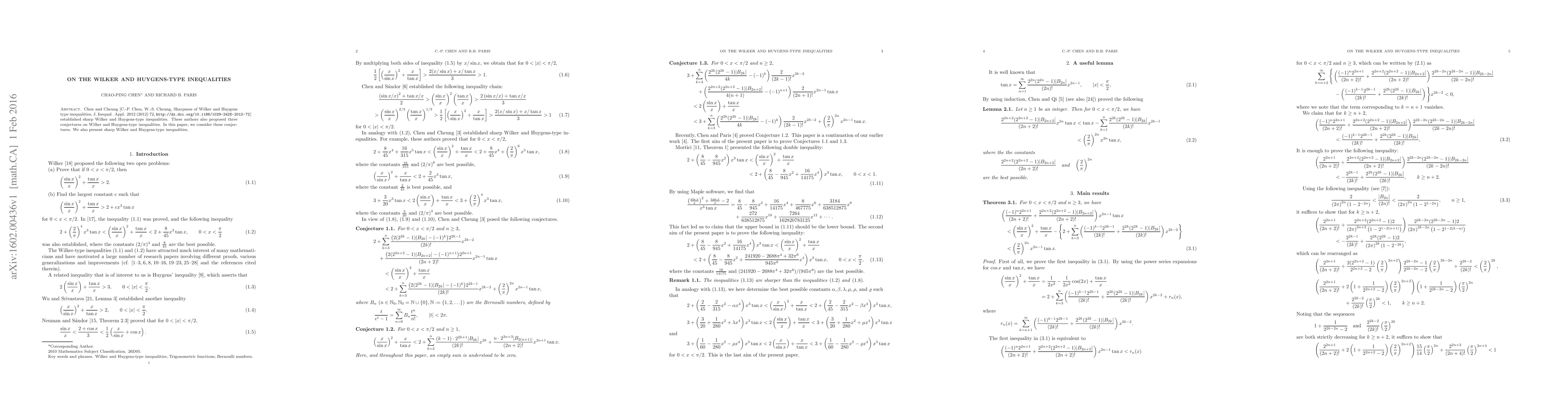 Chen and Cheung [C.-P. Chen, W.-S. Cheung, Sharpness of Wilker and Huygens type inequalities, J. Inequal. Appl. 2012 (2012) 72, \url{http://dx.doi.org/10.1186/1029-242X-2012-72}] established sharp Wilker and Huygens-type inequalities. These authors also proposed three conjectures on Wilker and Huygens-type inequalities. In this paper, we consider these conjectures. We also present sharp Wilker and Huygens-type inequalities.