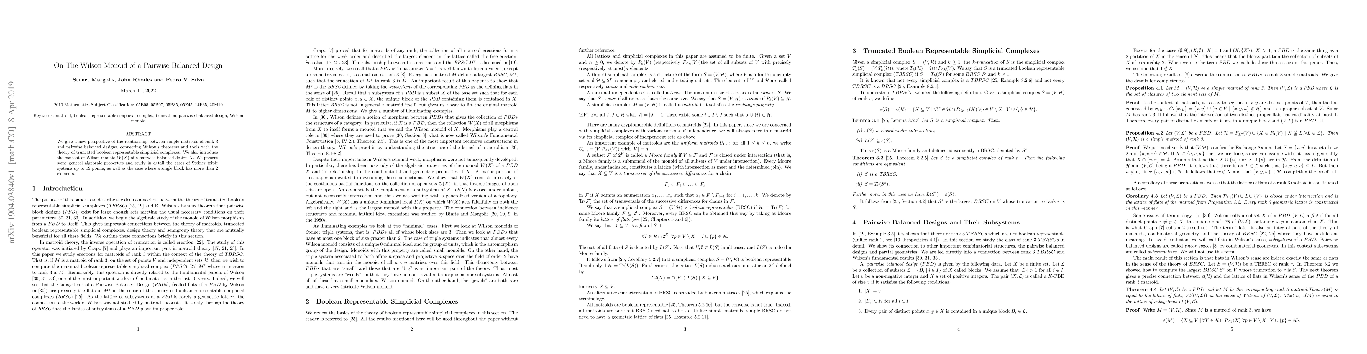 We give a new perspective of the relationship between simple matroids of rank 3 and pairwise balanced designs, connecting Wilson's theorems and tools with the theory of truncated boolean representable simplicial complexes. We also introduce the concept of Wilson monoid W(X) of a pairwise balanced design X. We present some general algebraic properties and study in detail the cases of Steiner triple systems up to 19 points, as well as the case where a single block has more than 2 elements