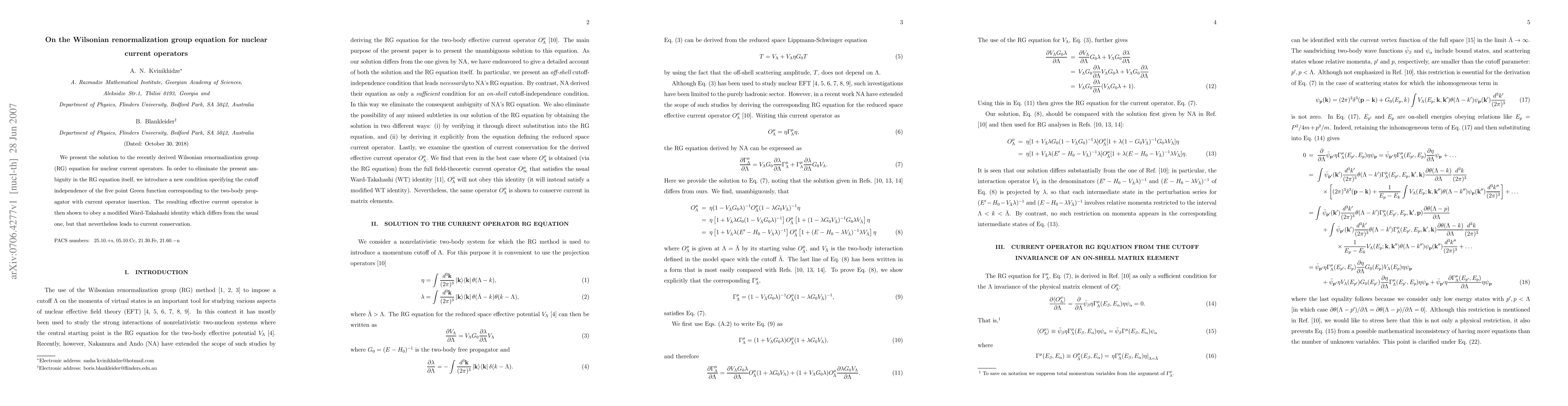 This paper solves the Wilsonian renormalization group equation for nuclear current operators, introducing a new condition to resolve ambiguity and achieve cutoff independence, resulting in an effective current operator that obeys a modified Ward-Takahashi identity while maintaining current conservation.