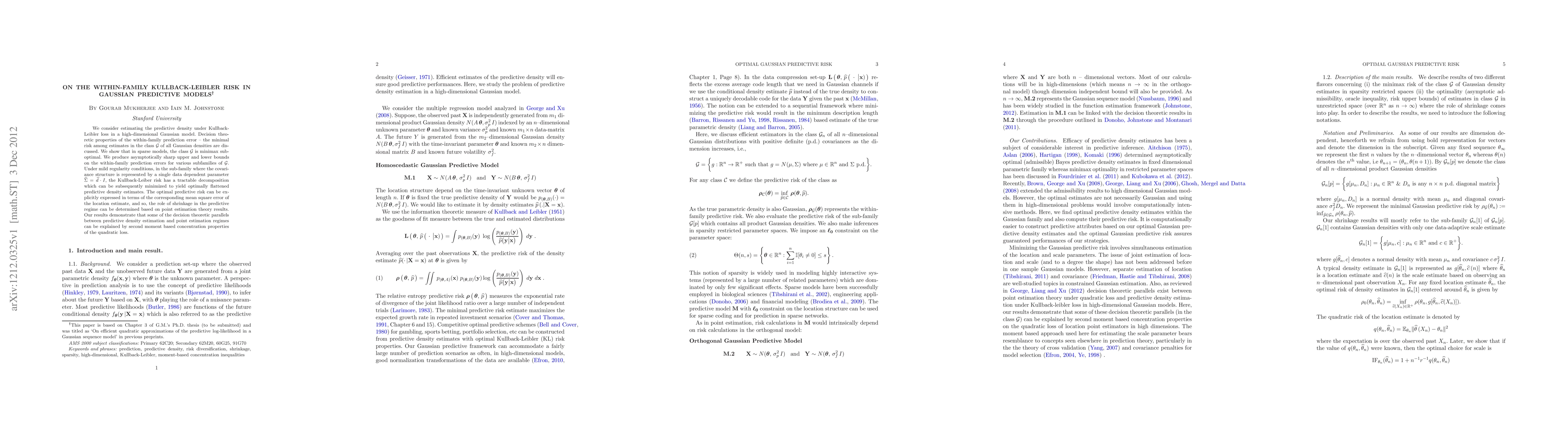 We consider estimating the predictive density under Kullback-Leibler loss in a high-dimensional Gaussian model. Decision theoretic properties of the within-family prediction error -- the minimal risk among estimates in the class $\mathcal{G}$ of all Gaussian densities are discussed. We show that in sparse models, the class $\mathcal{G}$ is minimax sub-optimal. We produce asymptotically sharp upper and lower bounds on the within-family prediction errors for various subfamilies of $\mathcal{G}$. Under mild regularity conditions, in the sub-family where the covariance structure is represented by a single data dependent parameter $\Shat=\dhat \cdot I$, the Kullback-Leiber risk has a tractable decomposition which can be subsequently minimized to yield optimally flattened predictive density estimates. The optimal predictive risk can be explicitly expressed in terms of the corresponding mean square error of the location estimate, and so, the role of shrinkage in the predictive regime can be determined based on point estimation theory results. Our results demonstrate that some of the decision theoretic parallels between predictive density estimation and point estimation regimes can be explained by second moment based concentration properties of the quadratic loss.