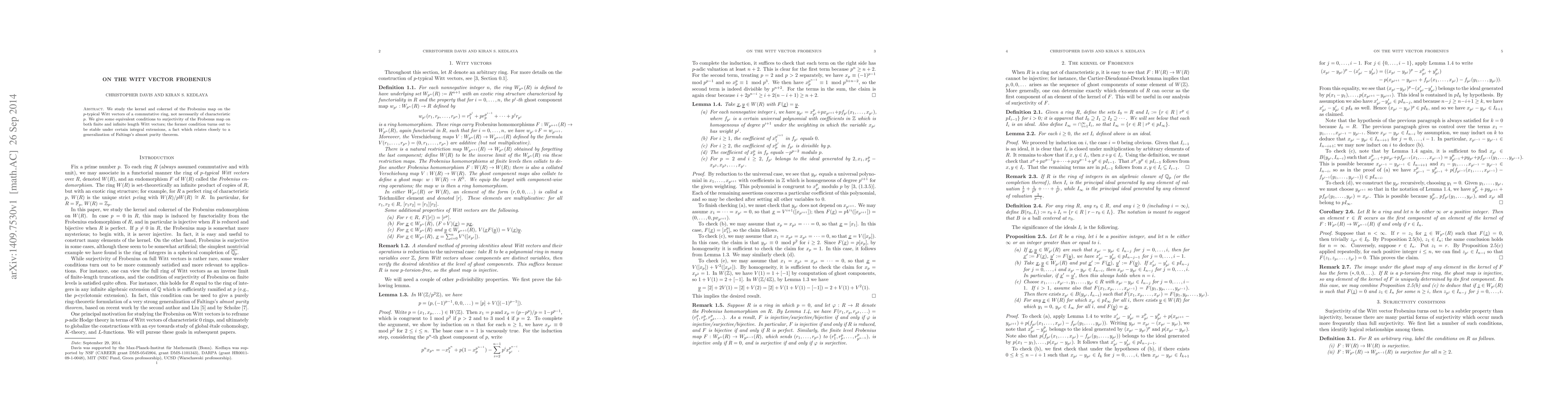 This research paper explores the properties of the Frobenius map on Witt vectors, focusing on conditions for surjectivity in finite and infinite length vectors, with implications for integral extensions and a generalization of Faltings's almost purity theorem.
