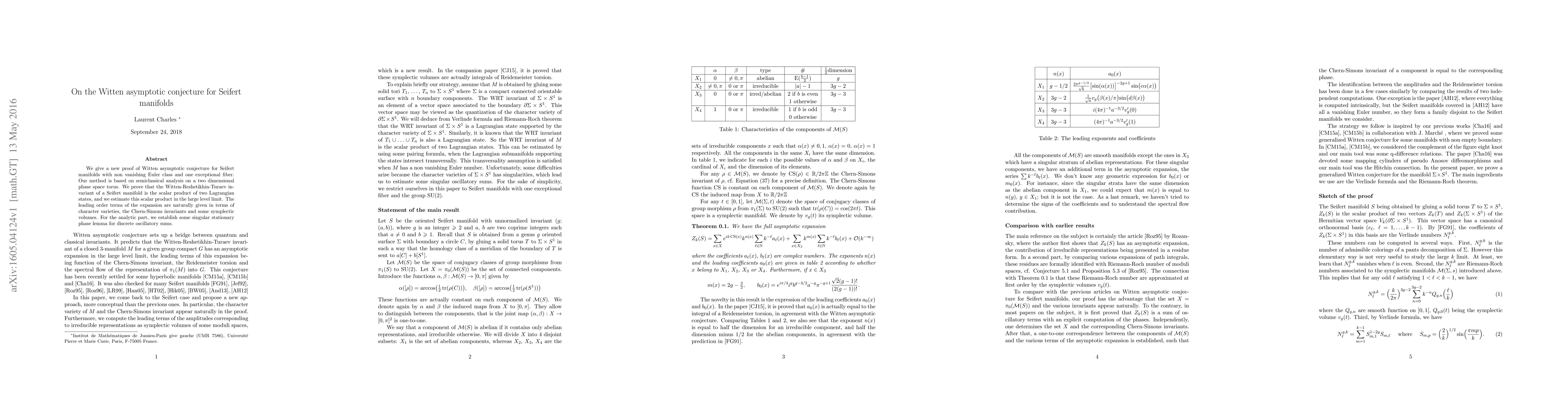 This paper provides a new proof for Witten's asymptotic conjecture for Seifert manifolds using semiclassical analysis on a two-dimensional phase space torus. It establishes that the Witten-Reshetikhin-Turaev invariant equals the scalar product of two Lagrangian states, with leading order terms expressed in terms of character varieties, Chern-Simons invariants, and symplectic volumes.