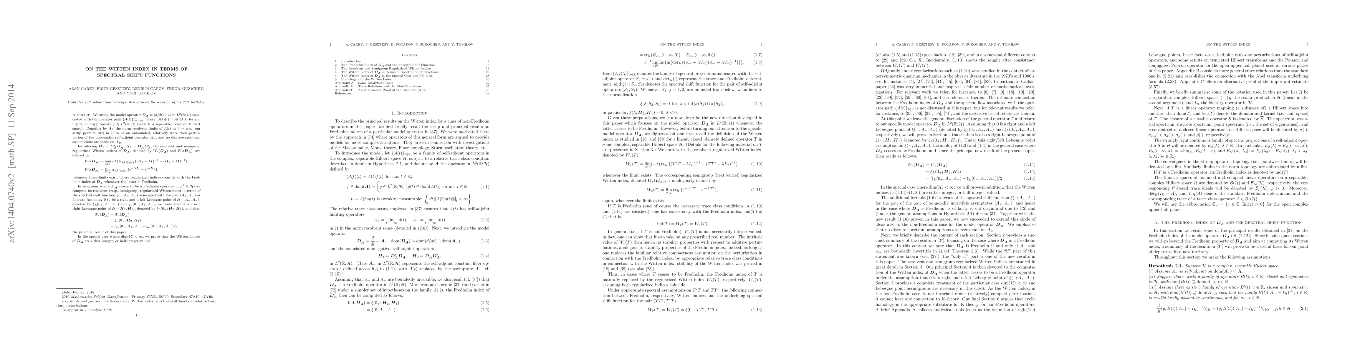 We study the model operator $\mathbf{D}_{\mathbf{A}} = (d/dt) + \mathbf{A}$ in $L^2(\mathbb{R};\mathcal{H})$ associated with the operator path $\{A(t)\}_{t=-\infty}^{\infty}$, where $(\mathbf{A} f)(t) = A(t) f(t)$ for a.e.\ $t\in\mathbb{R}$, and appropriate $f \in L^2(\mathbb{R};\mathcal{H})$ (with $\mathcal{H}$ a separable, complex Hilbert space). Denoting by $A_{\pm}$ the norm resolvent limits of $A(t)$ as $t \to \pm \infty$, our setup permits $A(t)$ in $\mathcal{H}$ to be an unbounded, relatively trace class perturbation of the unbounded self-adjoint operator $A_-$, and no discrete spectrum assumptions are made on $A_{\pm}$. We introduce resolvent and semigroup regularized Witten indices of $\mathbf{D}_{\mathbf{A}}$, denoted by $W_r$ and $W_s$, and prove that these regularized indices coincide with the Fredholm index of $\mathbf{D}_{\mathbf{A}}$ whenever the latter is Fredholm. In situations where $\mathbf{D}_{\mathbf{A}}$ ceases to be a Fredholm operator in $L^2(\mathbb{R};\mathcal{H})$ we compute its resolvent (resp., semigroup) regularized Witten index in terms of the spectral shift function $\xi(\,\cdot\,;A_+,A_-)$ associated with the pair $(A_+, A_-)$ as follows: Assuming $0$ to be a right and a left Lebesgue point of $\xi(\,\cdot\,\, ; A_+, A_-)$, denoted by $\xi_L(0_+; A_+,A_-)$ and $\xi_L(0_-; A_+, A_-)$, we prove that $0$ is also a right Lebesgue point of $\xi(\,\cdot\,\, ; \mathbf{H_2}, \mathbf{H_1})$, denoted by $\xi_L(0_+; \mathbf{H_2}, \mathbf{H_1})$, and that \begin{align*} W_r(\mathbf{D}_{\mathbf{A}}) &= W_s(\mathbf{D}_{\mathbf{A}}) \\ & = \xi_L(0_+; \mathbf{H_2}, \mathbf{H_1}) \\ & = [\xi_L(0_+; A_+,A_-) + \xi_L(0_-; A_+, A_-)]/2, \end{align*} the principal result of this paper. In the special case where $\dim(\mathcal{H}) < \infty$, we prove that the Witten indices of $\mathbf{D}_{\mathbf{A}}$ are either integer, or half-integer-valued.