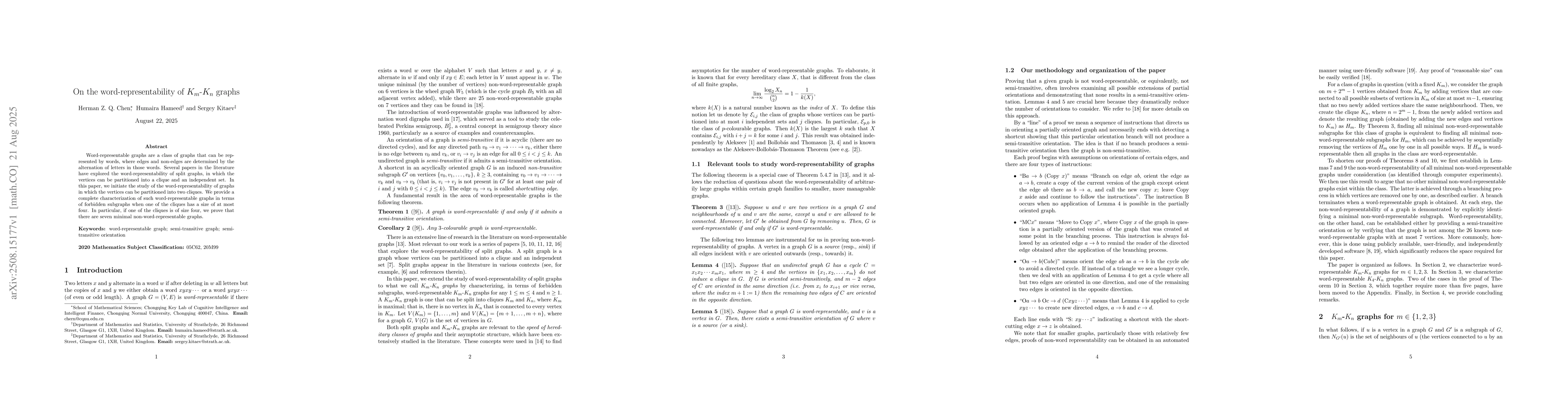 Word-representable graphs are a class of graphs that can be represented by words, where edges and non-edges are determined by the alternation of letters in those words. Several papers in the literature have explored the word-representability of split graphs, in which the vertices can be partitioned into a clique and an independent set. In this paper, we initiate the study of the word-representability of graphs in which the vertices can be partitioned into two cliques. We provide a complete characterization of such word-representable graphs in terms of forbidden subgraphs when one of the cliques has a size of at most four. In particular, if one of the cliques is of size four, we prove that there are seven minimal non-word-representable graphs.