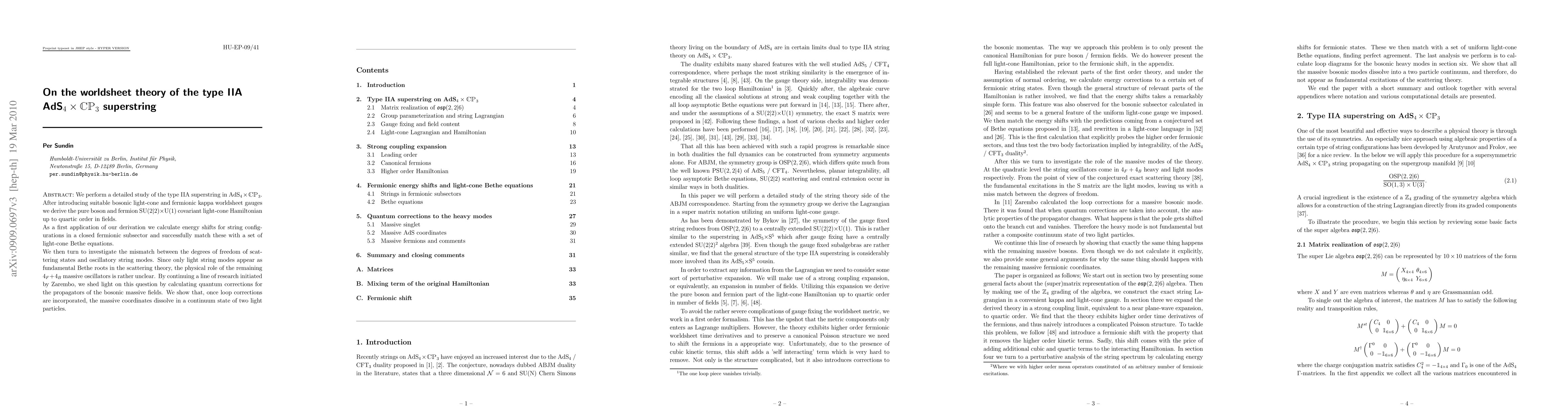 This paper studies the type IIA superstring in AdS(4) x CP(3), deriving a covariant light-cone Hamiltonian and matching energy shifts with light-cone Bethe equations. It investigates the physical role of massive oscillators, revealing that quantum corrections dissolve them into a continuum of light particles.