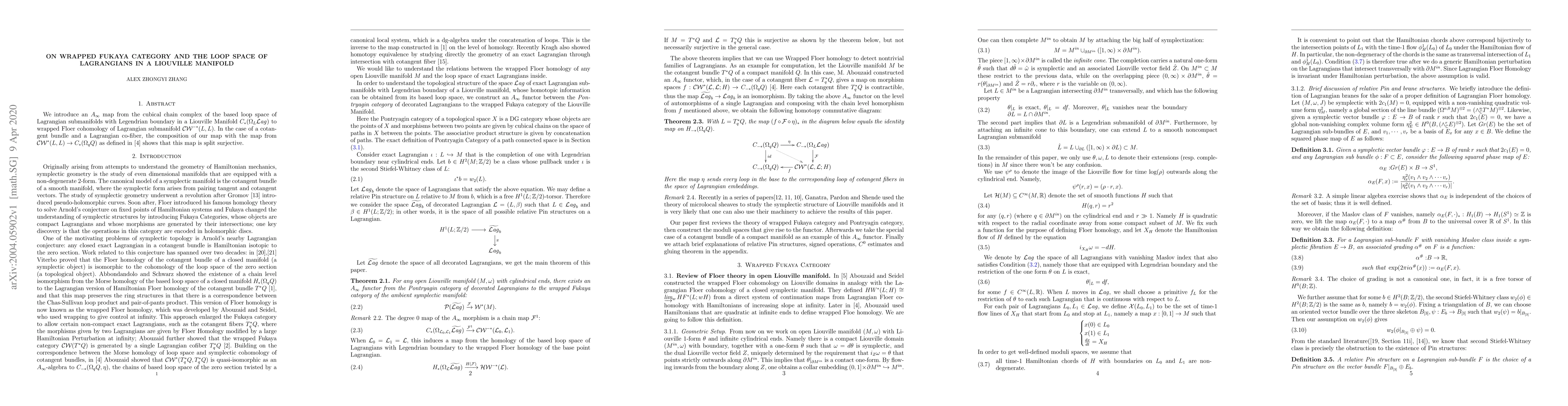 We introduce an $A_\infty$ map from the cubical chain complex of the based loop space of Lagrangian submanifolds with Legendrian boundary in a Liouville Manifold $C_{*}(\Omega_{L} \mathcal{L}\mathit{ag})$ to wrapped Floer cohomology of Lagrangian submanifold $\mathcal{CW}^{-*}(L,L)$. In the case of a cotangent bundle and a Lagrangian co-fiber, the composition of our map with a previously constructed map from $\mathcal{CW}^*(L,L) \to C_{*}(\Omega_q Q) $ shows that this map is split surjective.