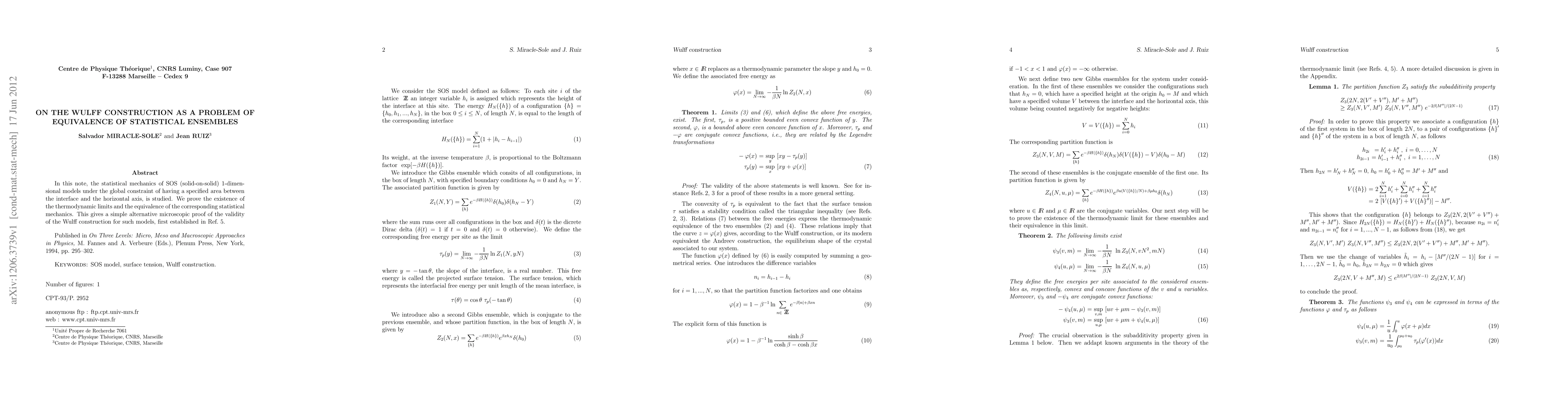 The statistical mechanics of SOS (solid-on-solid) 1-dimensional models under the global constraint of having a specified area between the interface and the horizontal axis, is studied. We prove the existence of the thermodynamic limits and the equivalence of the corresponding statistical mechanics. This gives a simple alternative microscopic proof of the validity of the Wulff construction for such models.