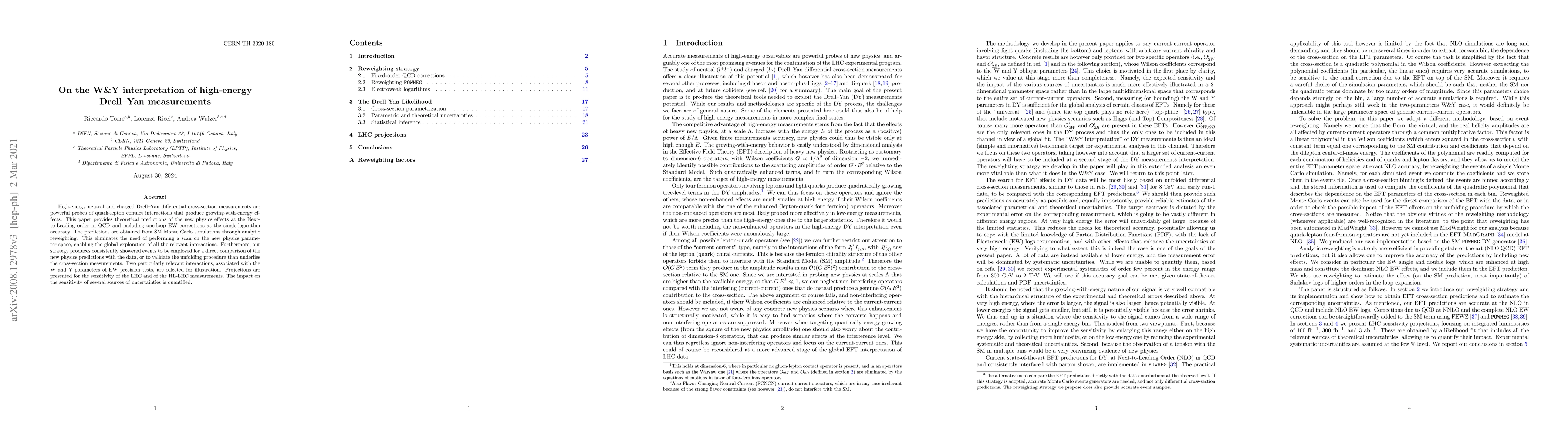 This paper provides theoretical predictions for high-energy Drell-Yan measurements, focusing on quark-lepton contact interactions, using SM Monte Carlo simulations and analytic reweighting. It highlights the W and Y parameters for EW precision tests, projecting the sensitivity of LHC and HL-LHC measurements while quantifying uncertainties.