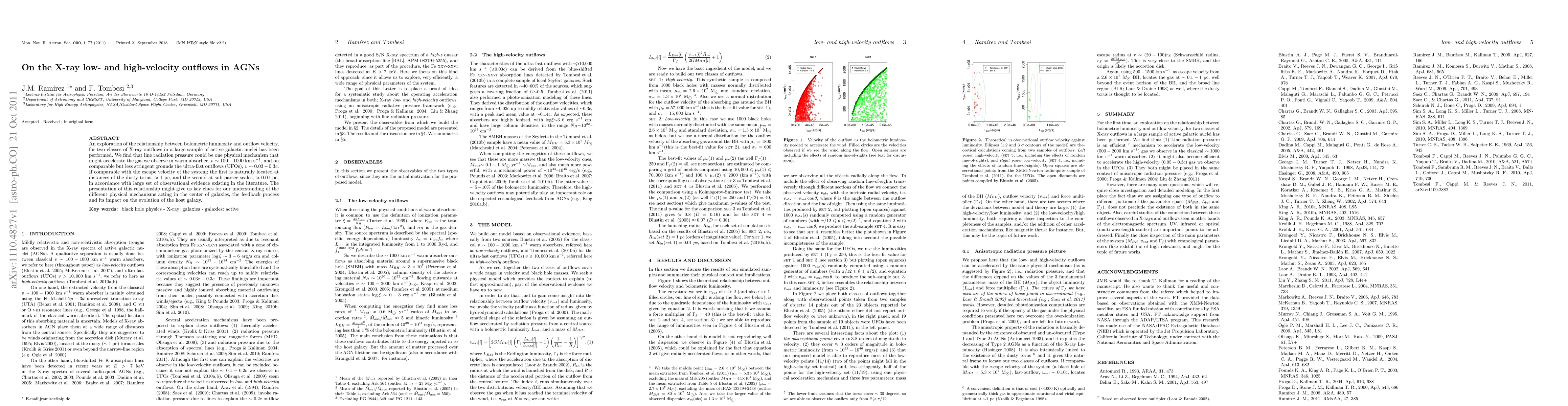 An exploration of the relationship between bolometric luminosity and outflow velocity, for two classes of X-ray outflows in a large sample of active galactic nuclei has been performed. We find that line radiation pressure could be one physical mechanism that might accelerate the gas we observe in warm absorber, v~100-1000 km/s, and on comparable but less stringent grounds the ultra-fast outflows (UFOs), v~0.03-0.3c. If comparable with the escape velocity of the system; the first is naturally located at distances of the dusty torus, ~ 1 pc, and the second at sub-parsec scales, ~ 0.01 pc, in accordance with large set of observational evidence existing in the literature. The presentation of this relationship might give us key clues for our understanding of the different physical mechanisms acting in the center of galaxies, the feedback process and its impact on the evolution of the host galaxy.