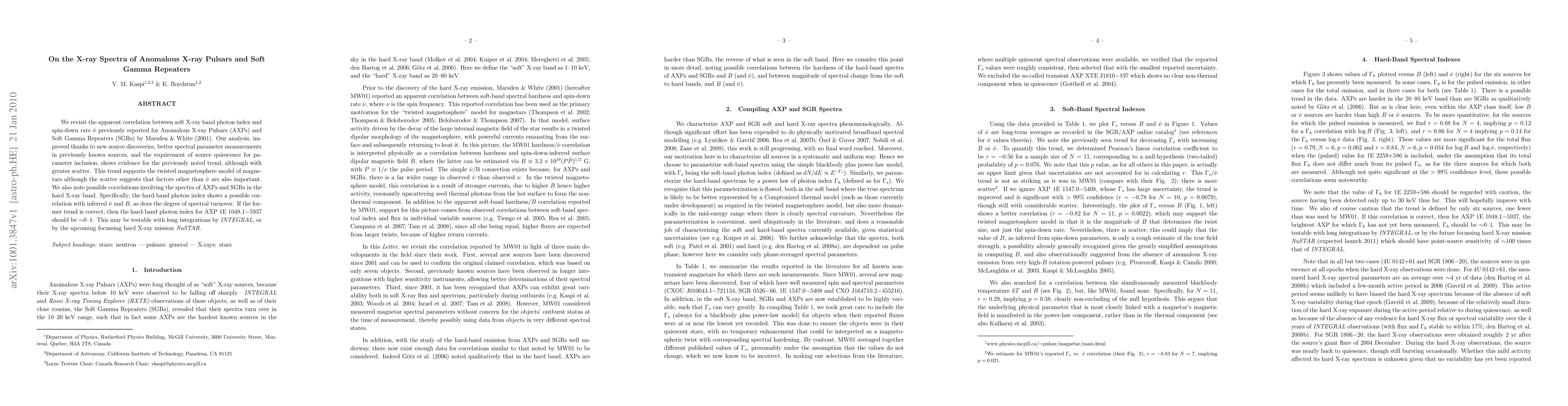 We revisit the apparent correlation between soft X-ray band photon index and spin-down rate nudot previously reported for Anomalous X-ray Pulsars (AXPs) and Soft Gamma Repeaters (SGRs) by Marsden & White (2001). Our analysis, improved thanks to new source discoveries, better spectral parameter measurements in previously known sources, and the requirement of source quiescence for parameter inclusion, shows evidence for the previously noted trend, although with greater scatter. This trend supports the twisted magnetosphere model of magnetars although the scatter suggests that factors other than nudot are also important. We also note possible correlations involving the spectra of AXPs and SGRs in the hard X-ray band. Specifically, the hard-band photon index shows a possible correlation with inferred nudot and B, as does the degree of spectral turnover. If the former trend is correct, then the hard-band photon index for AXP 1E 1048.1-5937 should be ~0--1. This may be testable with long integrations by INTEGRAL, or by the upcoming focussing hard X-ray mission NuSTAR.