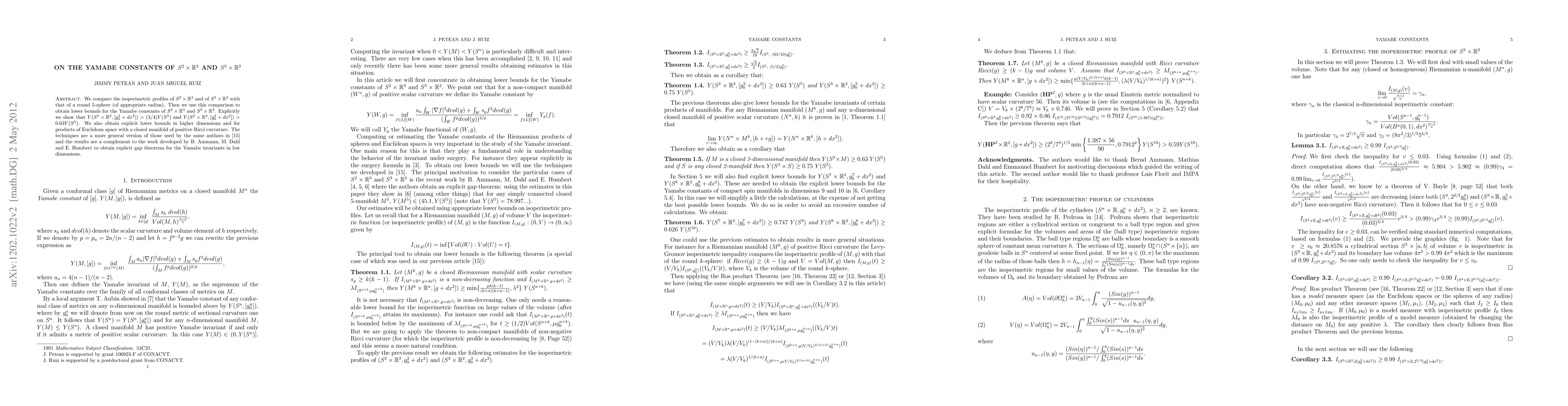 This paper compares the isoperimetric profiles of $S^2 \times \mathbb{R}^3$ and $S^3 \times \mathbb{R}^2$ to a round 5-sphere, using this comparison to derive lower bounds for their Yamabe constants, showing $Y(S^3 \times \mathbb{R}^2) > (3/4) Y(S^5)$ and $Y(S^2 \times \mathbb{R}^3) > 0.63 Y(S^5)$. The techniques extend previous work and complement results on Yamabe invariants.