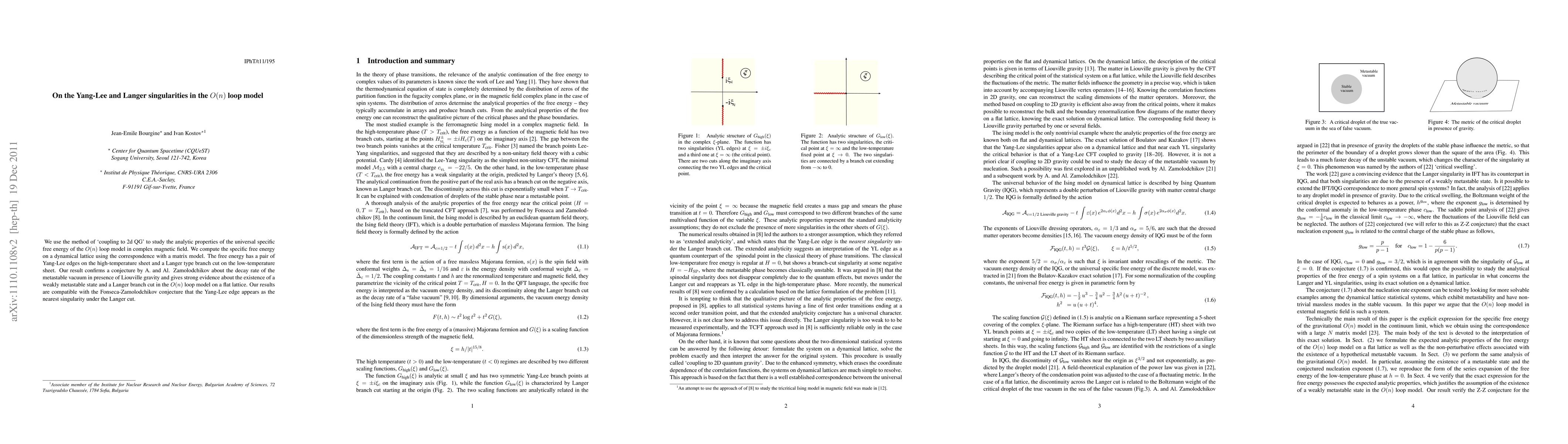 We use the method of `coupling to 2d QG' to study the analytic properties of the universal specific free energy of the O(n) loop model in complex magnetic field. We compute the specific free energy on a dynamical lattice using the correspondence with a matrix model. The free energy has a pair of Yang-Lee edges on the high-temperature sheet and a Langer type branch cut on the low-temperature sheet. Our result confirms a conjecture by A. and Al. Zamolodchikov about the decay rate of the metastable vacuum in presence of Liouville gravity and gives strong evidence about the existence of a weakly metastable state and a Langer branch cut in the O(n) loop model on a flat lattice. Our results are compatible with the Fonseca-Zamolodchikov conjecture that the Yang-Lee edge appears as the nearest singularity under the Langer cut.