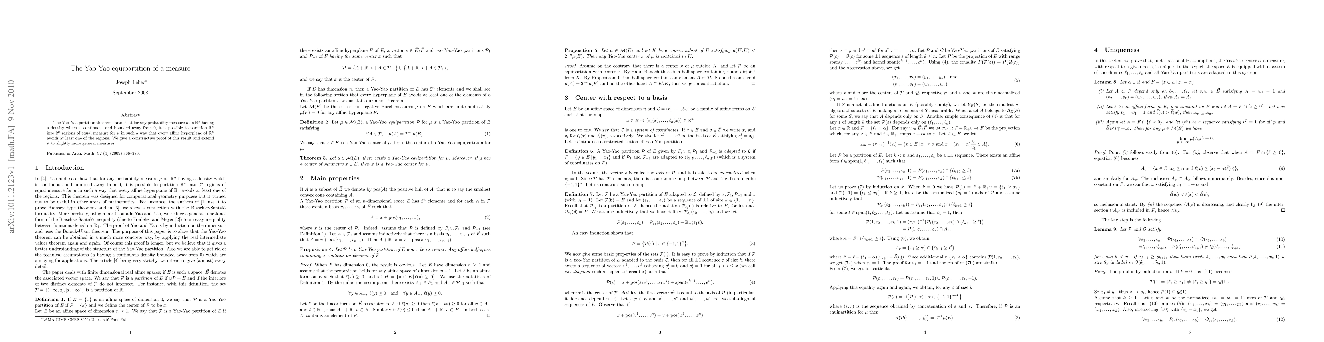 The Yao-Yao partition theorem proves that a continuous, bounded probability density function can be divided into 2^n regions of equal measure, with no hyperplane avoiding any region, offering insights into geometric probability theory.