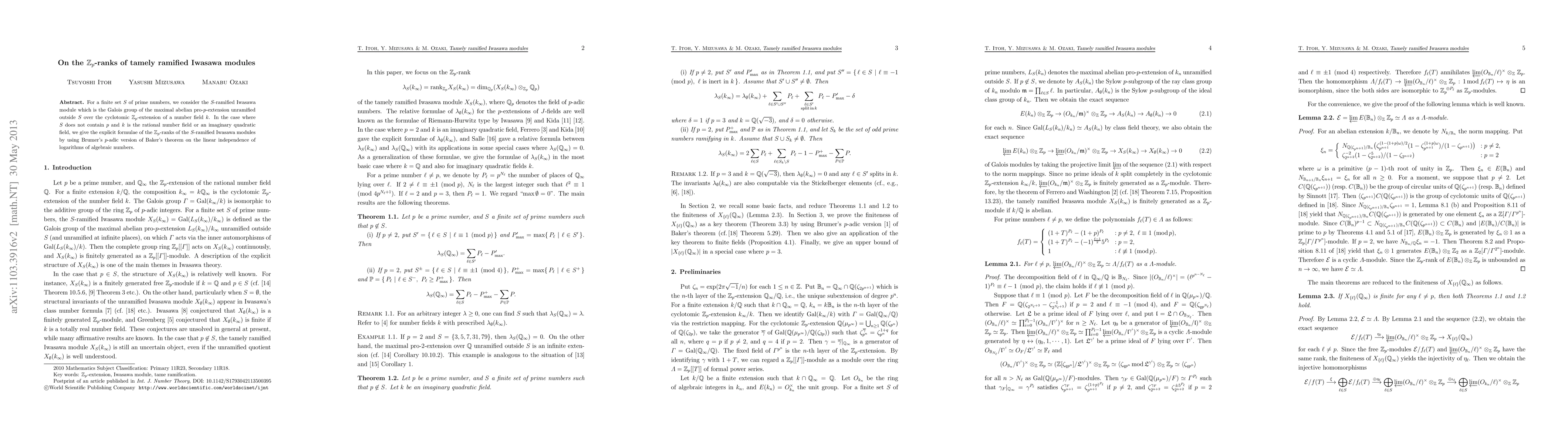 This paper investigates the Z_p-ranks of tamely ramified Iwasawa modules for cyclotomic Z_p-extensions of number fields, specifically for rational and imaginary quadratic fields, without the prime p in the set S of ramified primes. It employs Brumer's p-adic theorem to derive explicit formulae for the free ranks of these modules.