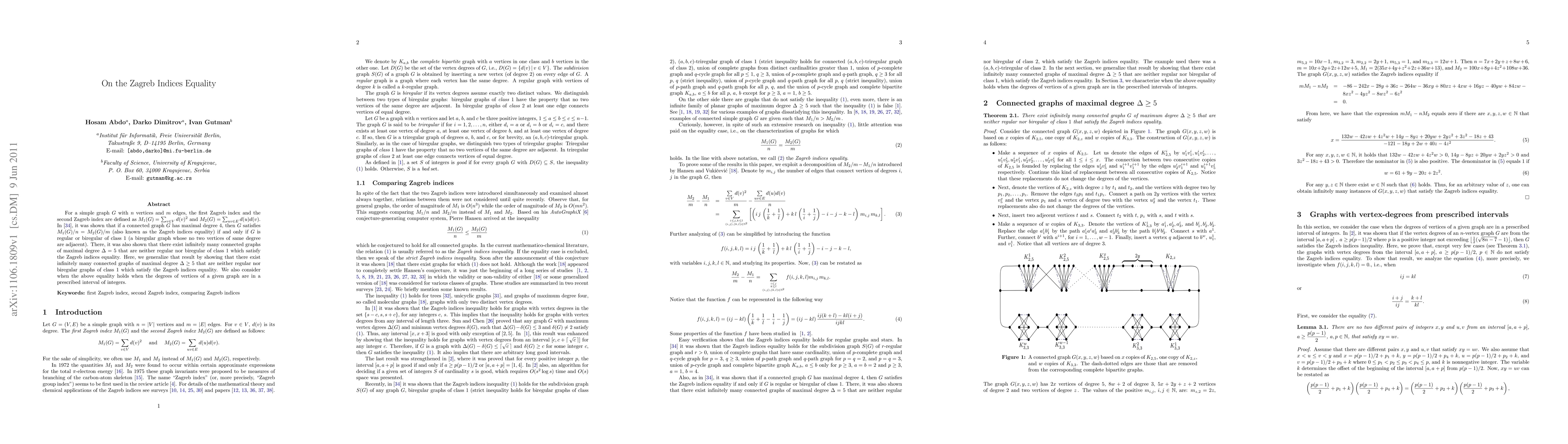 For a simple graph $G$ with $n$ vertices and $m$ edges, the first Zagreb index and the second Zagreb index are defined as $M_1(G)=\sum_{v\in V}d(v)^2 $ and $M_2(G)=\sum_{uv\in E}d(u)d(v)$. In \cite{VGFAD}, it was shown that if a connected graph $G$ has maximal degree 4, then $G$ satisfies $M_1(G)/n = M_2(G)/m$ (also known as the Zagreb indices equality) if and only if $G$ is regular or biregular of class 1 (a biregular graph whose no two vertices of same degree are adjacent). There, it was also shown that there exist infinitely many connected graphs of maximal degree $\Delta= 5$ that are neither regular nor biregular of class 1 which satisfy the Zagreb indices equality. Here, we generalize that result by showing that there exist infinitely many connected graphs of maximal degree $\Delta \geq 5$ that are neither regular nor biregular graphs of class 1 which satisfy the Zagreb indices equality. We also consider when the above equality holds when the degrees of vertices of a given graph are in a prescribed interval of integers.