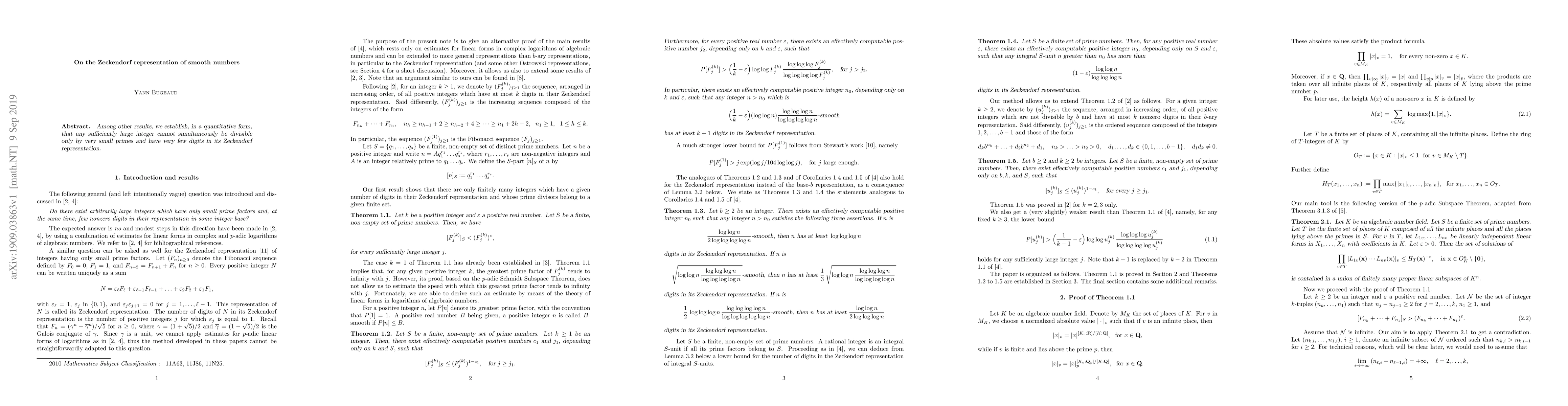 Summary: This paper quantitatively demonstrates that large integers cannot be divisible solely by small primes while having a Zeckendorf representation with few digits. The Zeckendorf representation is a unique way of expressing numbers using Fibonacci numbers.