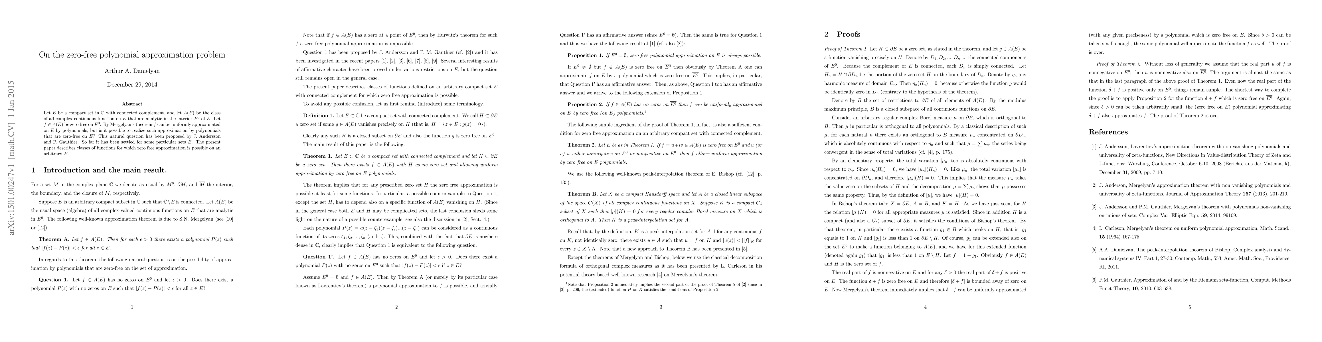 Let $E$ be a compact set in $\mathbb C$ with connected complement, and let $A(E)$ be the class of all complex continuous function on $E$ that are analytic in the interior $E^0$ of $E$. Let $f \in A(E)$ be zero free on $E^0$. By Mergelyan's theorem $f$ can be uniformly approximated on $E$ by polynomials, but is it possible to realize such approximation by polynomials that are zero-free on $E$? This natural question has been proposed by J. Andersson and P. Gauthier. So far it has been settled for some particular sets $E$. The present paper describes classes of functions for which zero free approximation is possible on an arbitrary $E$.