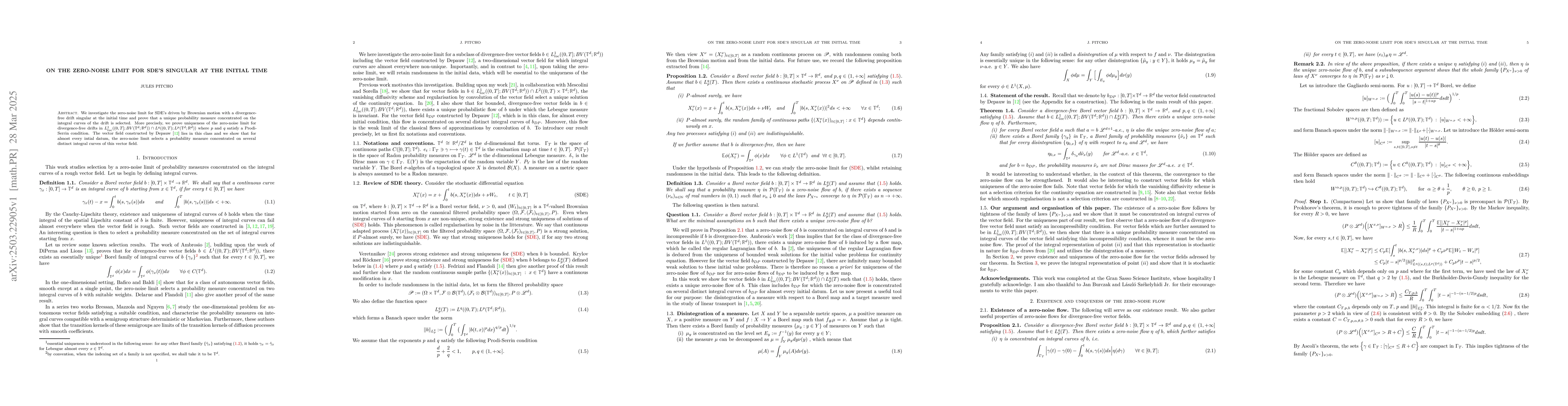 The paper establishes uniqueness of the zero-noise limit for a specific class of divergence-free drifts, providing a rigorous mathematical framework for analyzing singular SDEs at initial time.