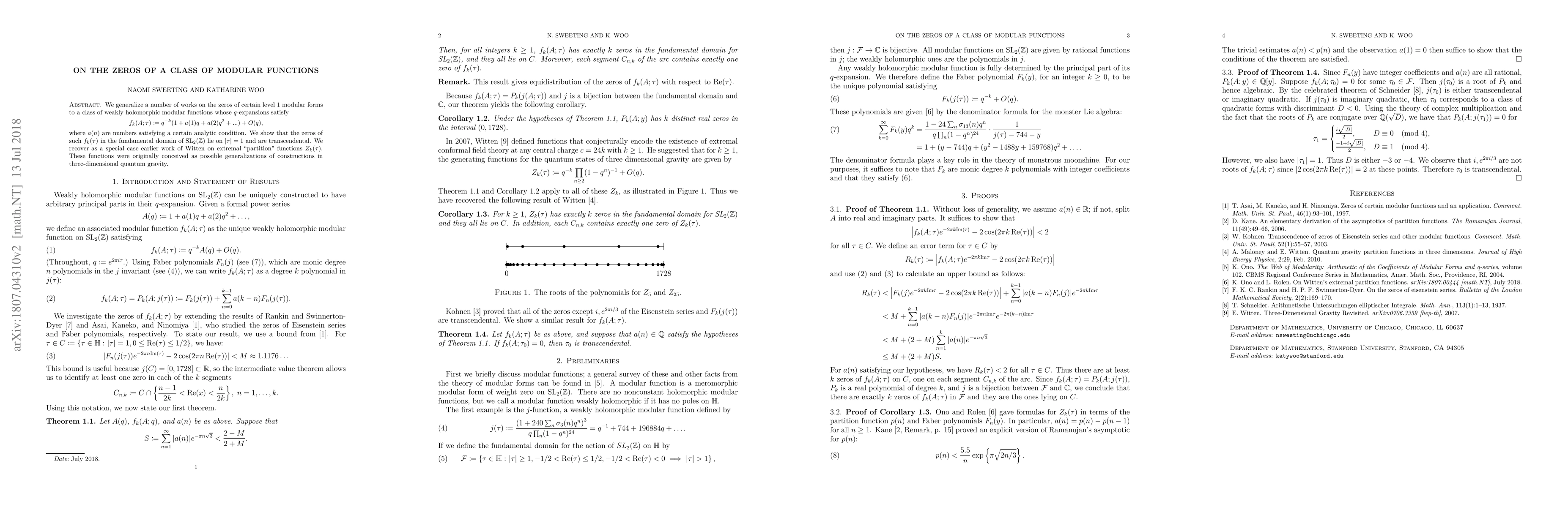 We generalize a number of works on the zeros of certain level 1 modular forms to a class of weakly holomorphic modular functions whose $q$-expansions satisfy \[ f_k(A, \tau) \colon = q^{-k}(1+a(1)q+a(2)q^2+...) + O(q),\] where $a(n)$ are numbers satisfying a certain analytic condition. We show that the zeros of such $f_k(\tau)$ in the fundamental domain of $SL_2(\mathbb{Z})$ lie on $|\tau|=1$ and are transcendental. We recover as a special case earlier work of Witten on extremal "partition" functions $Z_k(\tau)$. These functions were originally conceived as possible generalizations of constructions in three-dimensional quantum gravity.