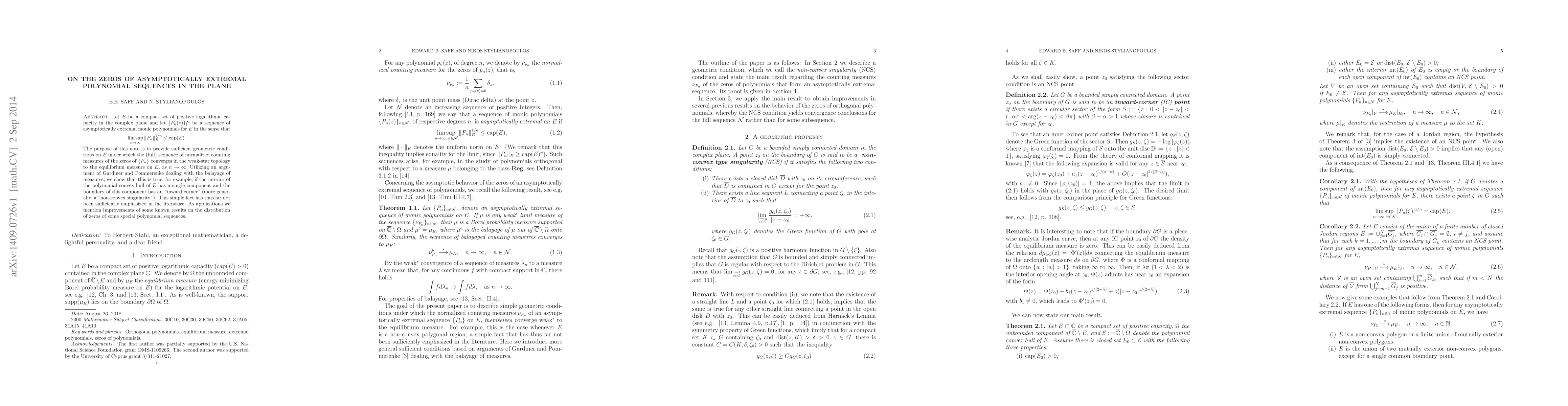 Let $E$ be a compact set of positive logarithmic capacity in the complex plane and let $\{P_n(z)\}_{1}^{\infty}$ be a sequence of asymptotically extremal monic polynomials for $E$ in the sense that \begin{equation*}%\label{} \limsup_{n\to\infty}\|P_n\|_E^{1/n}\le\mathrm{cap}(E). \end{equation*} The purpose of this note is to provide sufficient geometric conditions on $E$ under which the (full) sequence of normalized counting measures of the zeros of $\{P_n\}$ converges in the weak-star topology to the equilibrium measure on $E$, as $n\to\infty.$ Utilizing an argument of Gardiner and Pommerenke dealing with the balayage of measures, we show that this is true, for example, if the interior of the polynomial convex hull of $E$ has a single component and the boundary of this component has an "inward corner" (more generally, a "non-convex singularity"). This simple fact has thus far not been sufficiently emphasized in the literature. As applications we mention improvements of some known results on the distribution of zeros of some special polynomial sequences.