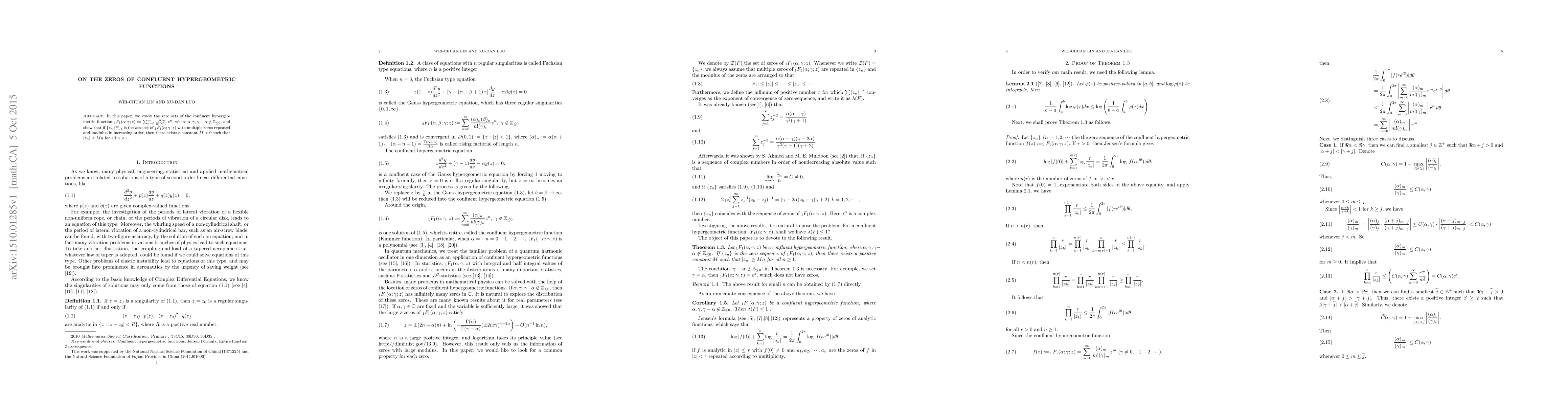 This research paper investigates the zero sets of the confluent hypergeometric function _{1}F_{1}(alpha;gamma;z). It proves that the magnitude of its zeros increases at least linearly with their index, i.e., there exists a constant M>0 such that |z_n|≥ Mn for all n≥1, given the zeros are in increasing modulus and some have multiplicity.