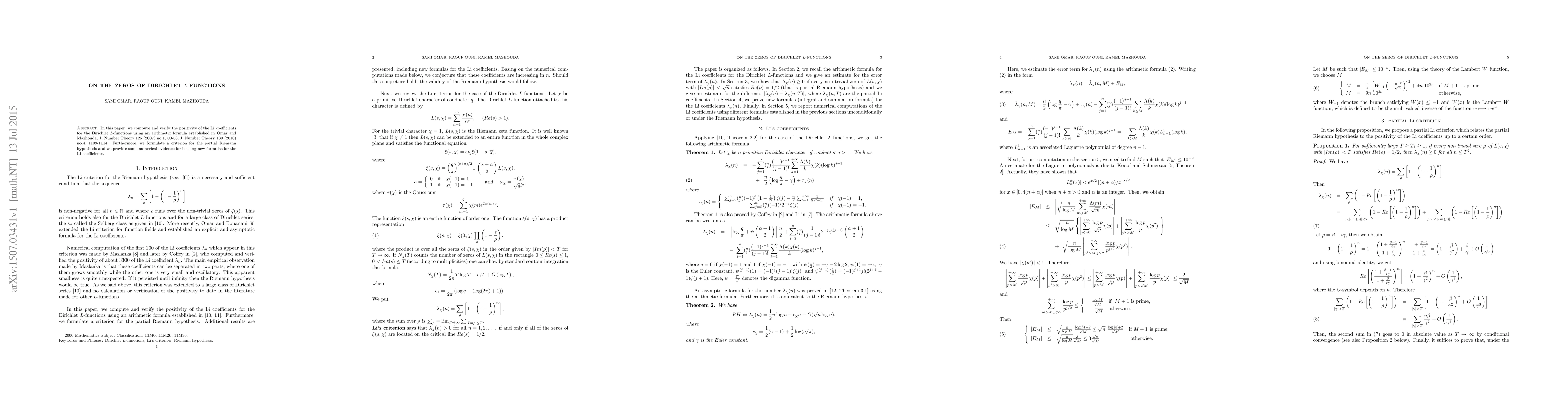 Researchers computed and verified the positivity of Li coefficients for Dirichlet L-functions using an established arithmetic formula. They also provided a criterion for the partial Riemann hypothesis and offered numerical evidence through new formulas for the Li coefficients.