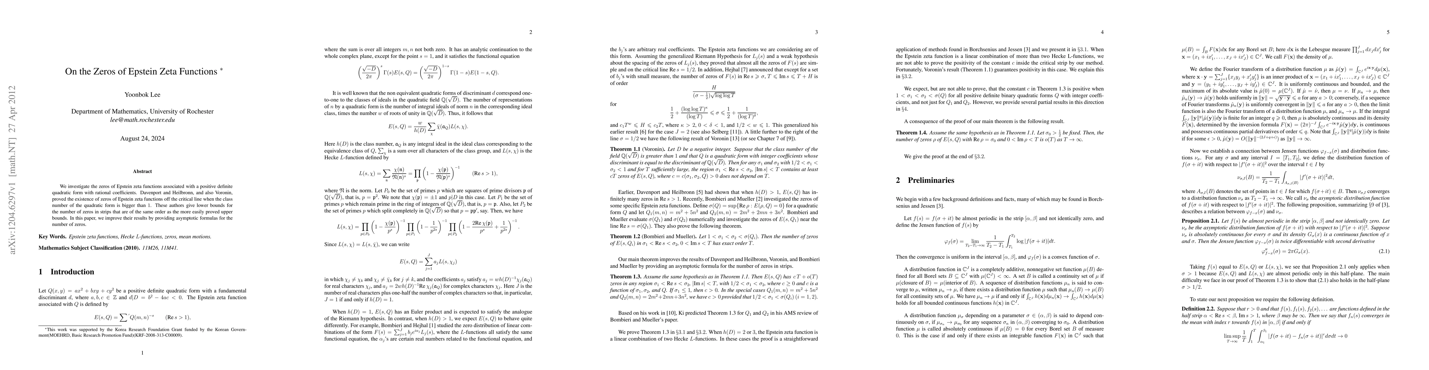 This paper improves upon previous results regarding the zeros of Epstein zeta functions associated with positive definite quadratic forms, providing asymptotic formulas for the number of zeros in strips when the class number exceeds 1. It refines the lower bounds established by Davenport, Heilbronn, and Voronin.