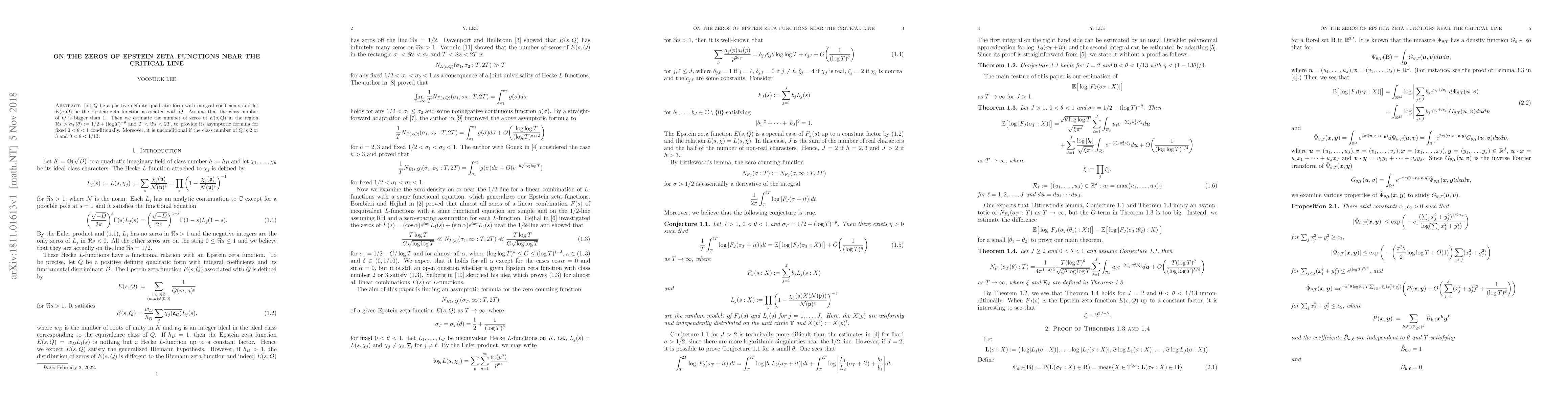 This paper estimates the number of zeros of Epstein zeta functions associated with positive definite quadratic forms in a specified strip near the critical line, providing an asymptotic formula under certain conditions on the class number of the quadratic form. The results are unconditional for specific small class numbers.
