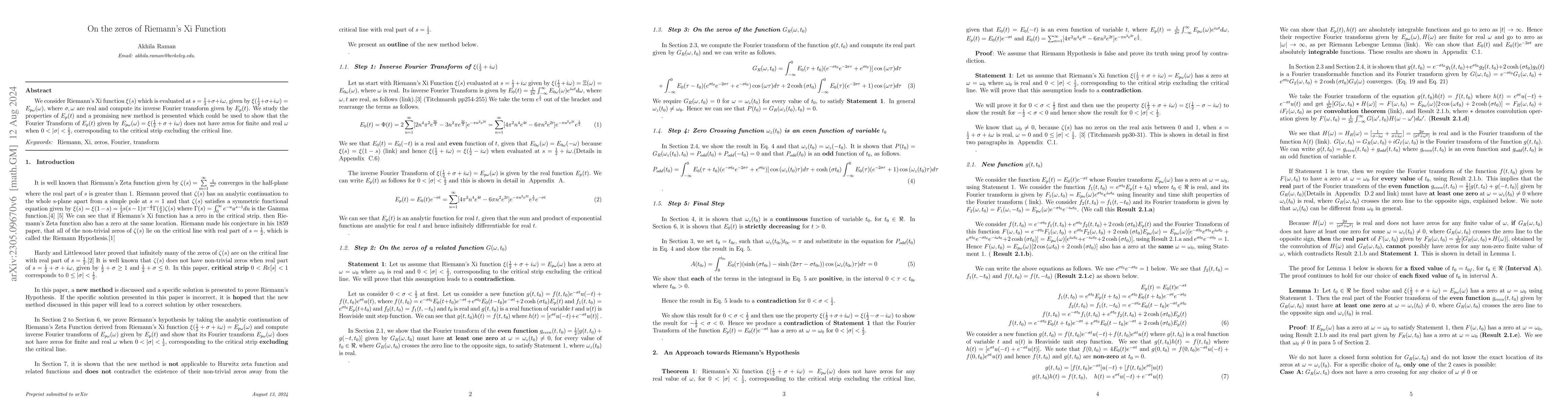 We consider Riemann's Xi function $\xi(s)$ which is evaluated at $s = \frac{1}{2} + \sigma + i \omega$, given by $\xi(\frac{1}{2} + \sigma + i \omega)= E_{p\omega}(\omega)$, where $\sigma, \omega$ are real and compute its inverse Fourier transform given by $E_p(t)$. We study the properties of $E_p(t)$ and a promising new method is presented which could be used to show that the Fourier Transform of $E_p(t)$ given by $E_{p\omega}(\omega) = \xi(\frac{1}{2} + \sigma + i \omega)$ does not have zeros for finite and real $\omega$ when $0 < |\sigma| < \frac{1}{2}$, corresponding to the critical strip excluding the critical line.