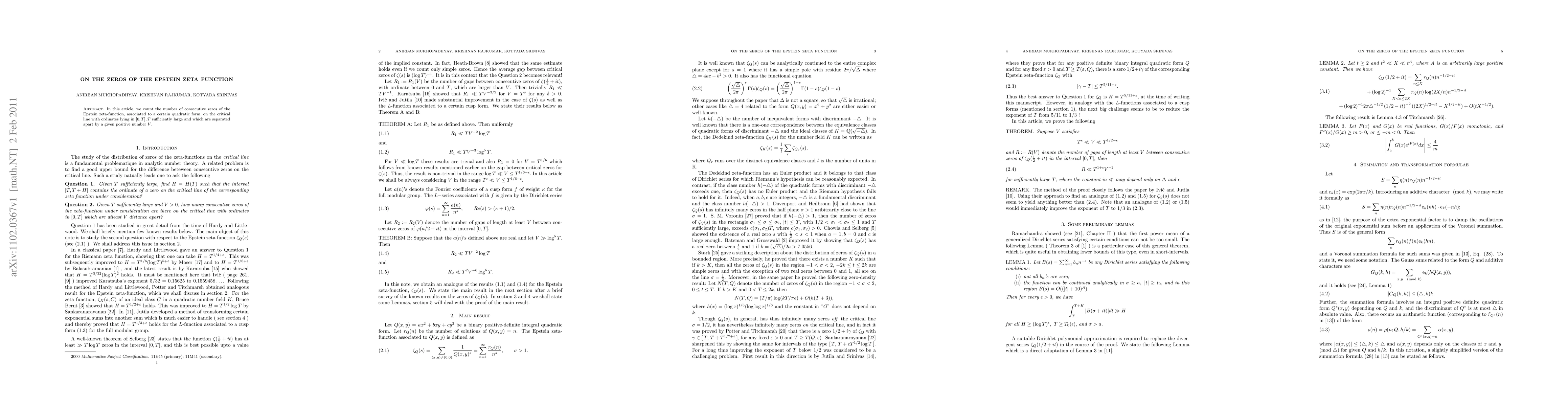 The paper quantifies the number of consecutive zeros of the Epstein zeta function on the critical line within the interval $[0,T]$ and separated by a positive number $V$, for sufficiently large $T$. The study focuses on the distribution of these zeros linked to a specific quadratic form.