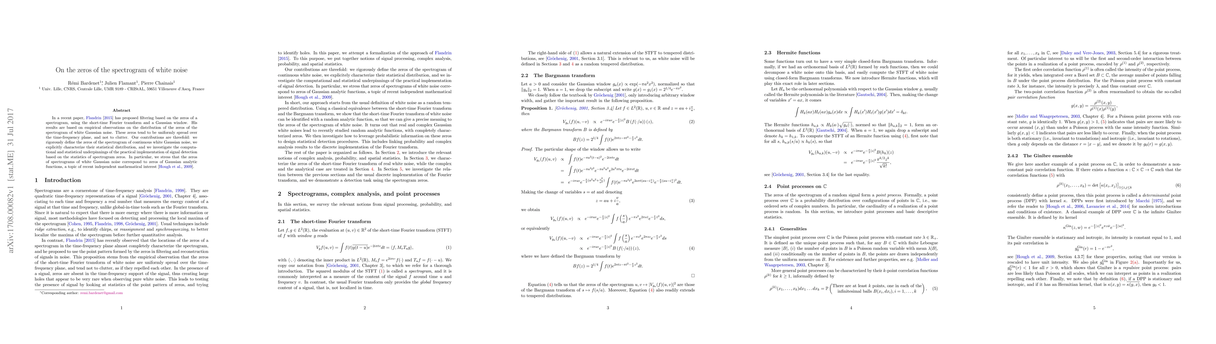 This paper rigorously defines and statistically characterizes the zeros of the spectrogram of continuous white Gaussian noise, revealing their uniform distribution over the time-frequency plane. It also explores the practical implementation of signal detection based on these zeros, linking them to zeros of Gaussian analytic functions.
