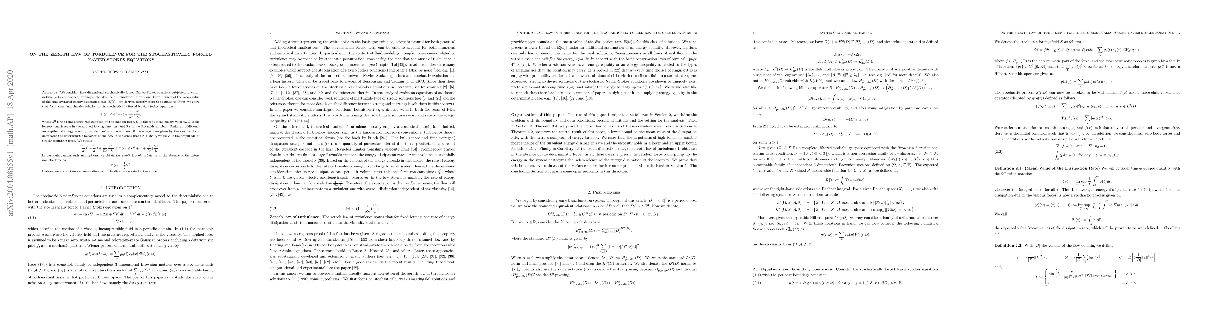 We consider three-dimensional stochastically forced Navier-Stokes equations subjected to white-in-time (colored-in-space) forcing in the absence of boundaries. Upper and lower bounds of the mean value of the time-averaged energy dissipation rate, $\mathbb{E} [\langle\varepsilon \rangle] $, are derived directly from the equations. First, we show that for a weak (martingale) solution to the stochastically forced Navier-Stokes equations, \[ \mathbb{E} [\langle\varepsilon \rangle] \leq G^2 + (2+ \frac{1}{Re})\frac{U^3}{L},\] where $G^2$ is the total energy rate supplied by the random force, $U$ is the root-mean-square velocity, $L$ is the longest length scale in the applied forcing function, and $Re$ is the Reynolds number. Under an additional assumption of energy equality, we also derive a lower bound if the energy rate given by the random force dominates the deterministic behavior of the flow in the sense that $G^2 > 2 F U$, where $F$ is the amplitude of the deterministic force. We obtain, \[\frac{1}{3} G^2 - \frac{1}{3} (2+ \frac{1}{Re})\frac{U^3}{L} \leq \mathbb{E} [\langle\varepsilon \rangle] \leq G^2 + (2+ \frac{1}{Re})\frac{U^3}{L}\,.\] In particular, under such assumptions, we obtain the zeroth law of turbulence in the absence of the deterministic force as, \[\mathbb{E} [\langle\varepsilon \rangle] = \frac{1}{2} G^2.\] Besides, we also obtain variance estimates of the dissipation rate for the model.