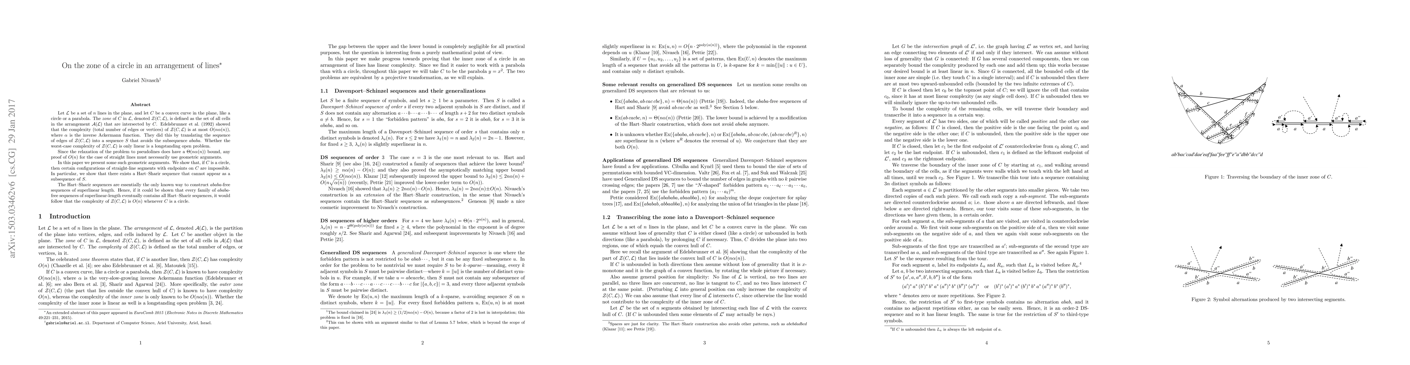 This paper presents geometric arguments to address the longstanding open problem of whether the complexity of zone Z(C,L) for a circle C in an arrangement of n lines L is linear (O(n)). The authors demonstrate that certain configurations of straight-line segments with endpoints on C are impossible, eliminating specific ababa-free sequences (Hart-Sharir sequences) from the sequence S. If all such sequences can be shown to appear in any $ababa$-free sequence of superlinear length, it would confirm that the complexity of Z(C,L) is O(n) when C is a circle.