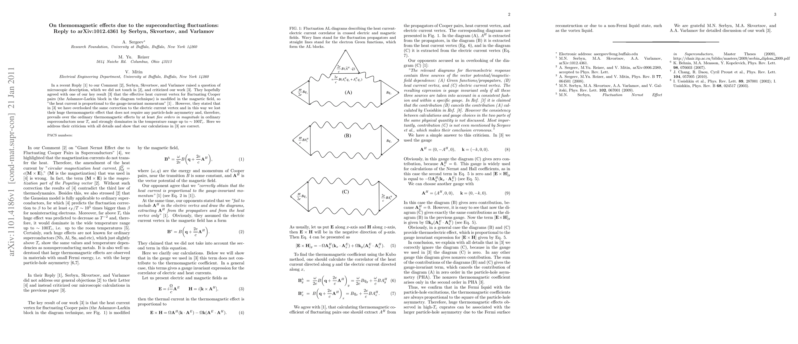In a recent Reply [arXiv:1012.4361] to our Comment [arXiv:0906.2389, accepted to PRL], Serbyn, Skvortsov, and Varlamov raised a question of microscopic description, which we did not touch in Comment, and criticized our work [Phys. Rev. B 77, 064501 (2008)]. They hopefully agreed with one of our key result that the effective heat current vertex for fluctuating Cooper pairs (the Aslamzov-Larkin block in the diagram technique) is modified in the magnetic field, so "the heat current is proportional to the gauge-invariant momentum". However, they stated that we have overlooked the same correction to the electric current vertex and in this way we lost their huge thermomagnetic effect that does not require any particle-hole asymmetry and, therefore, prevails over the ordinary thermomagnetic effects by at least five orders in magnitude in ordinary superconductors near T_c and strongly dominates in the temperature range up to ~ 100 T_c. Here we address their criticism with all details and show that our calculations are correct.