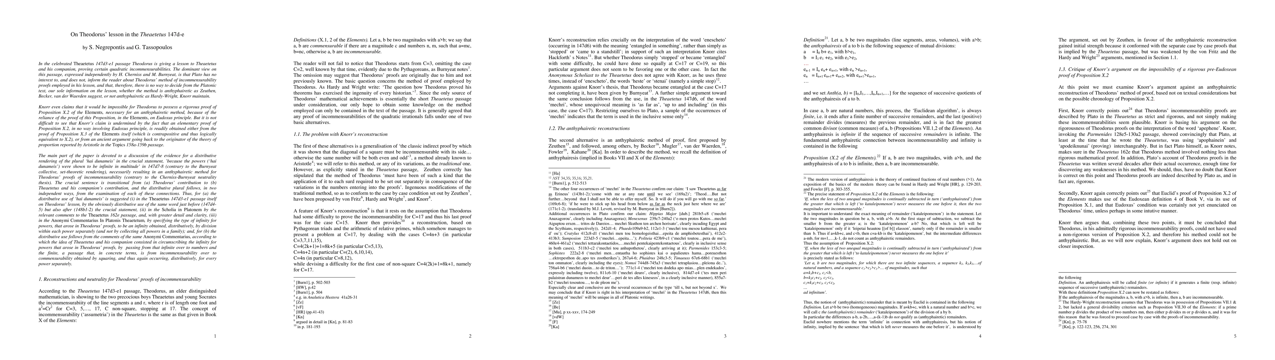 This paper argues against the dominant view that Plato does not inform readers about Theodorus' method for proving quadratic incommensurabilities in Theaetetus 147d-e. It supports a distributive interpretation of 'hai dunameis', suggesting Theodorus' method was anthyphairetic, contrary to the neutrality thesis of Cherniss and Burnyeat.