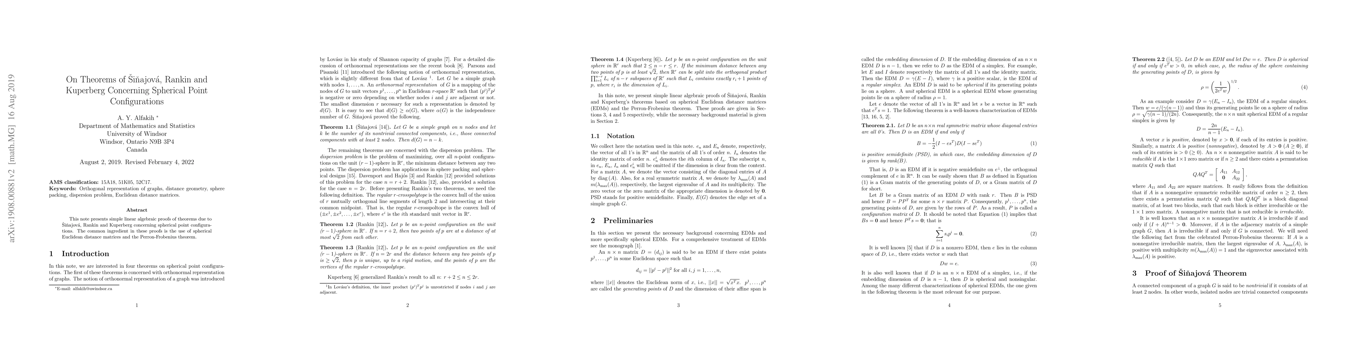 This note presents simple linear algebraic proofs of theorems due to Sinajova, Rankin and Kuperberg concerning spherical point configurations. The common ingredient in these proofs is the use of spherical Euclidean distance matrices and the Perron-Frobenius theorem.