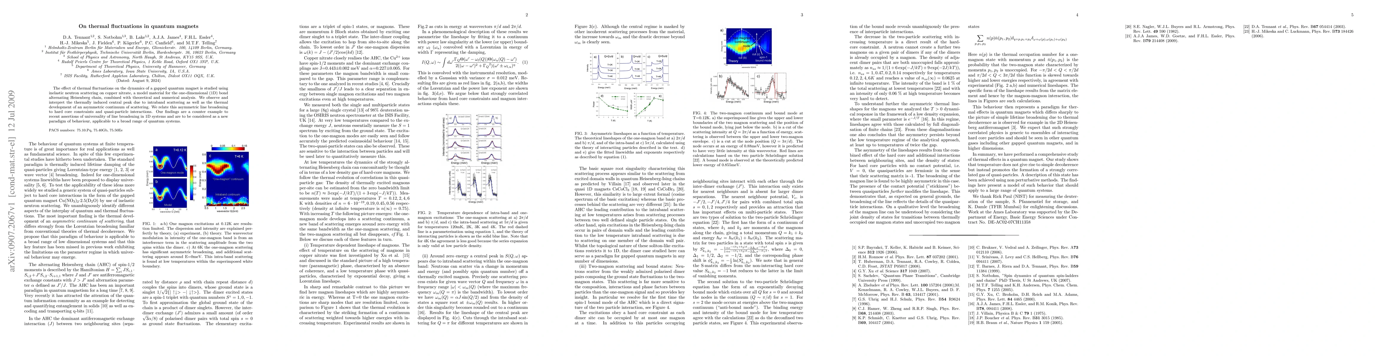 The effect of thermal fluctuations on the dynamics of a gapped quantum magnet is studied using inelastic neutron scattering on copper nitrate, a model material for the one-dimensional (1D) bond alternating Heisenberg chain, combined with theoretical and numerical analysis. We observe and interpret the thermally induced central peak due to intraband scattering as well as the thermal development of an asymmetric continuum of scattering. We relate this asymmetric line broadening to hard core constraints and quasi-particle interactions. Our findings are a counter example to recent assertions of universality of line broadening in 1D systems and are to be considered as a new paradigm of behaviour, applicable to a broad range of quantum systems.