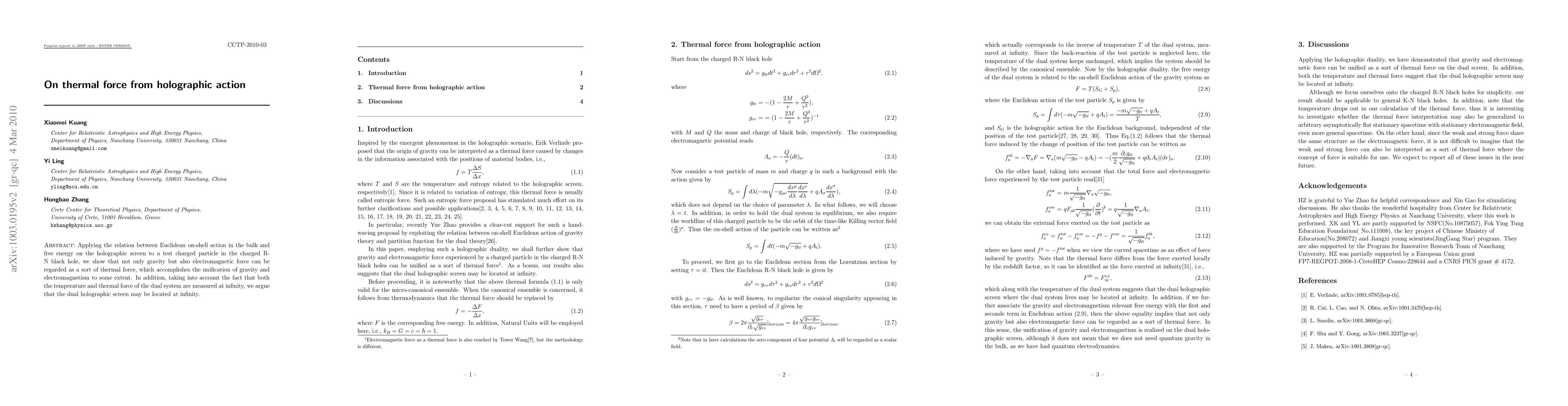 Applying the relation between Euclidean on-shell action in the bulk and free energy on the holographic screen to a test charged particle in the charged R-N black hole, we show that not only gravity but also electromagnetic force can be regarded as a sort of thermal force, which accomplishes the unification of gravity and electromagnetism to some extent. In addition, taking into account the fact that both the temperature and thermal force of the dual system are measured at infinity, we argue that the dual holographic screen may be located at infinity.