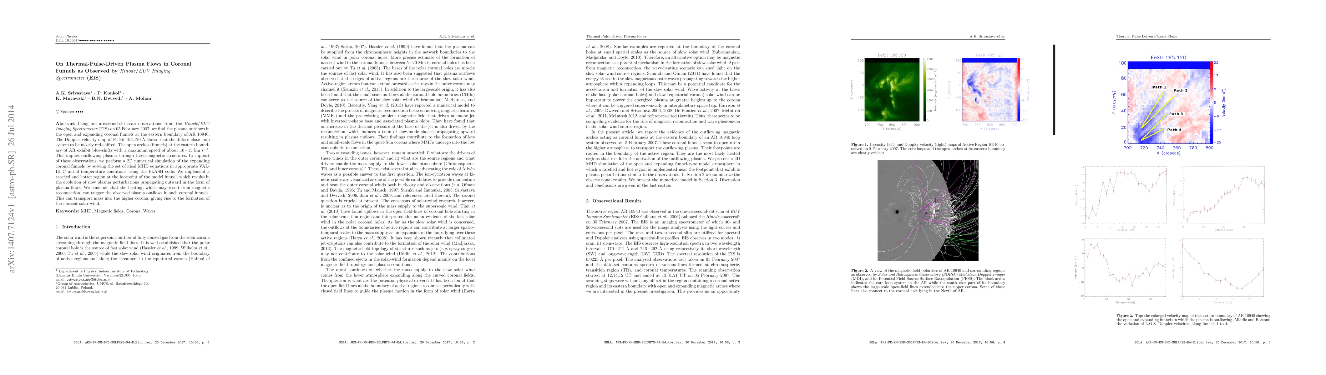 Using one-arcsecond-slit scan observations from the Hinode/EUV Imaging Spectrometer (EIS) on 05 February 2007, we find the plasma outflows in the open and expanding coronal funnels at the eastern boundary of AR 10940. The Doppler velocity map of Fe XII 195.120 A shows that the diffuse close-loop system to be mostly red-shifted. The open arches (funnels) at the eastern boundary of AR exhibit blue-shifts with a maximum speed of about 10-15 km/s. This implies outflowing plasma through these magnetic structures. In support of these observations, we perform a 2D numerical simulation of the expanding coronal funnels by solving the set of ideal MHD equations in appropriate VAL-III C initial temperature conditions using the FLASH code. We implement a rarefied and hotter region at the footpoint of the model funnel, which results in the evolution of slow plasma perturbations propagating outward in the form of plasma flows. We conclude that the heating, which may result from magnetic reconnection, can trigger the observed plasma outflows in such coronal funnels. This can transport mass into the higher corona, giving rise to the formation of the nascent solar wind.