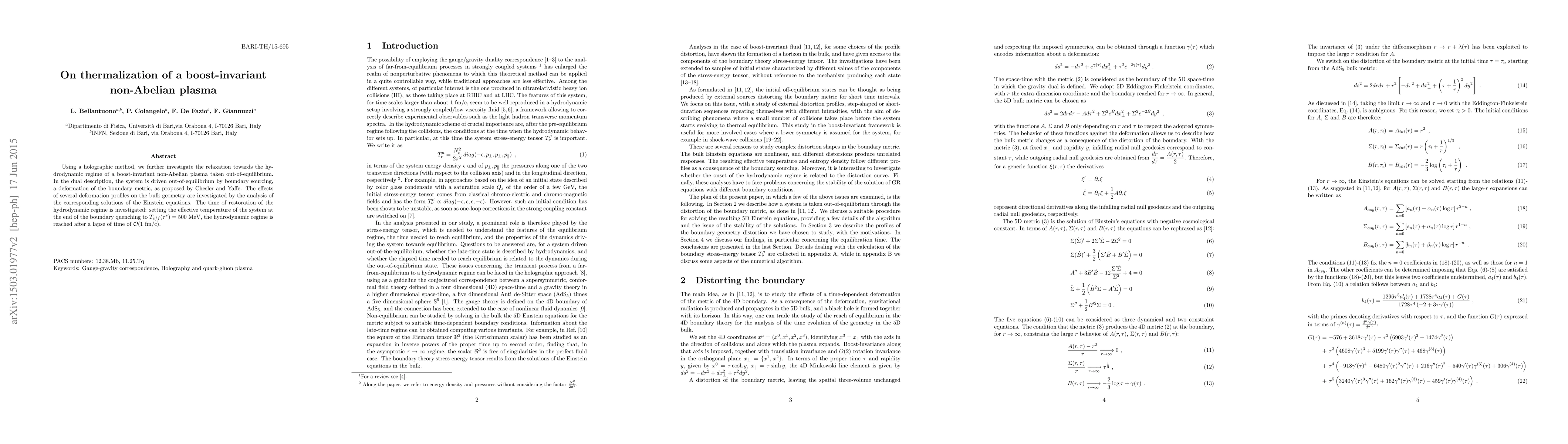Using a holographic method, we further investigate the relaxation towards the hydrodynamic regime of a boost-invariant non-Abelian plasma taken out-of-equilibrium. In the dual description, the system is driven out-of-equilibrium by boundary sourcing, a deformation of the boundary metric, as proposed by Chesler and Yaffe. The effects of several deformation profiles on the bulk geometry are investigated by the analysis of the corresponding solutions of the Einstein equations. The time of restoration of the hydrodynamic regime is investigated: setting the effective temperature of the system at the end of the boundary quenching to $T_{eff}(\tau^*)=500$ MeV, the hydrodynamic regime is reached after a lapse of time of ${\cal O}$(1 fm/c).