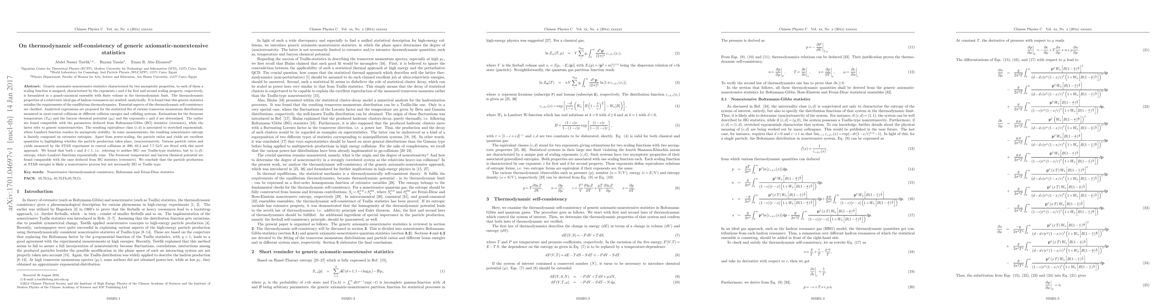 Generic axiomatic-nonextensive statistics characterized by two asymptotic properties, to each of them a scaling function is assigned, characterized by c and d for first and second scaling property, respectively, is formulated in a grand-canonical ensemble with finite volume in the thermodynamic limit. The thermodynamic properties of a relativistic ideal gas of hadron resonances are studied. It is found that this generic statistics satisfies the requirements of the equilibrium thermodynamics. Essential aspects of thermodynamic self-consistency are clarified. Analytical expressions are proposed for the statistical fits of various transverse momentum distributions measured in most-central collisions at different collision energies and colliding systems. Estimations for the freezeout temperature and chemical potential and both c and d are determined. The earlier are found compatible with the parameters deduced from Boltzmann-Gibbs (BG) statistics (extensive), while the latter refer to generic nonextensivity. The resulting equivalence class (c,d) is associated to stretched exponentials, where Lambert function reaches its asymptotic stability. In some measurements, the resulting nonextensive entropy is linearly composed of extensive entropies. Apart from power-scaling, the particle ratios and yields are excellent quantities to highlighting whether the particle production takes place, (non)extensively. Various particle ratios and yields measured by the STAR experiment in central collisions at 200, 62.4 and 7.7 GeV are fitted to this novel approach. We found that both c and d<1, i.e. referring to neither BG- nor Tsallis-type statistics, but to (c,d)-entropy, where Lambert functions exponentially raise. We conclude that the particle production at STAR energies is likely a nonextensive process but not necessarily BG or Tsallis type.