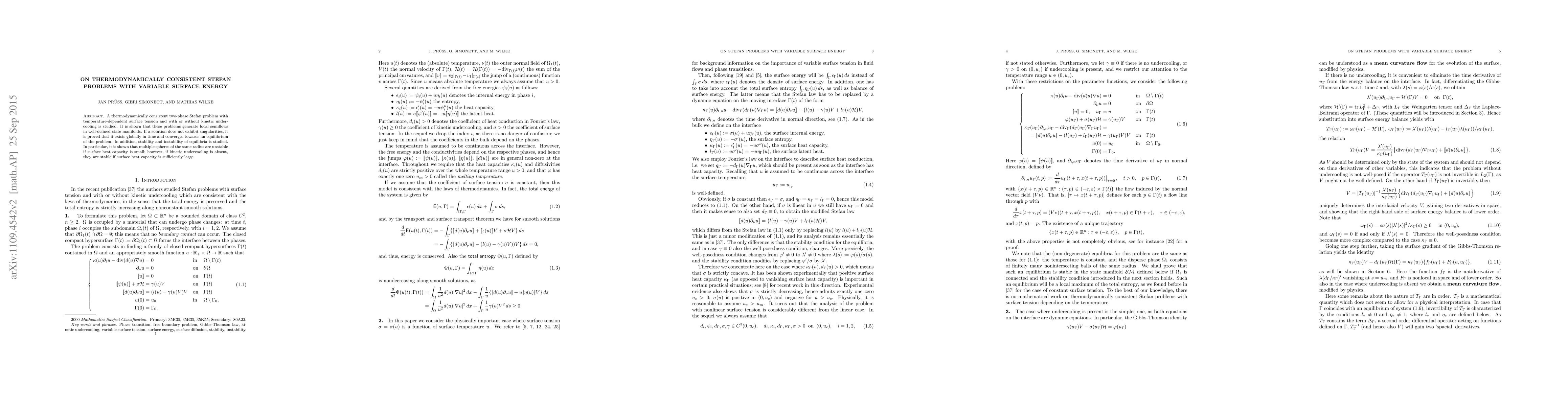 This paper investigates thermodynamically consistent Stefan problems with variable surface energy, proving global existence and stability of solutions under different conditions. It finds that multiple spheres are unstable with low surface heat capacity but stable with large surface heat capacity when kinetic undercooling is absent.