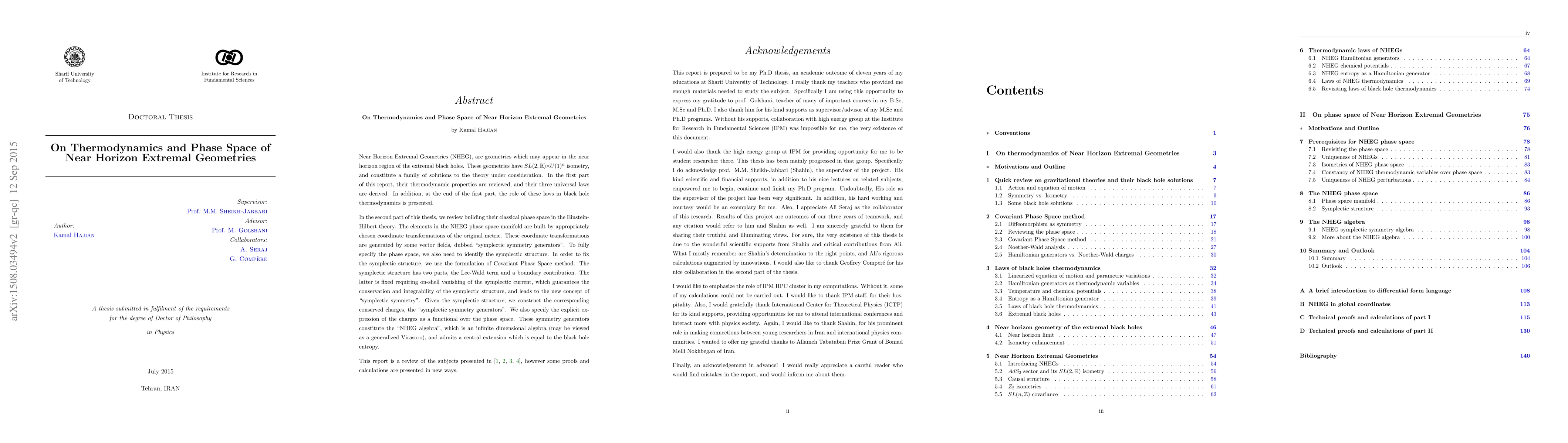Near Horizon Extremal Geometries (NHEG), are geometries which may appear in the near horizon region of the extremal black holes. These geometries have $SL(2,\mathbb{R})\!\times\!U(1)^n$ isometry, and constitute a family of solutions to the theory under consideration. In the first part of this report, their thermodynamic properties are reviewed, and their three universal laws are derived. In addition, at the end of the first part, the role of these laws in black hole thermodynamics is presented. In the second part of this thesis, we review building their classical phase space in the Einstein-Hilbert theory. The elements in the NHEG phase space manifold are built by appropriately chosen coordinate transformations of the original metric. These coordinate transformations are generated by some vector fields, dubbed "symplectic symmetry generators." To fully specify the phase space, we also need to identify the symplectic structure. In order to fix the symplectic structure, we use the formulation of Covariant Phase Space method. The symplectic structure has two parts, the Lee-Wald term and a boundary contribution. The latter is fixed requiring on-shell vanishing of the symplectic current, which guarantees the conservation and integrability of the symplectic structure, and leads to the new concept of "symplectic symmetry." Given the symplectic structure, we construct the corresponding conserved charges, the "symplectic symmetry generators." We also specify the explicit expression of the charges as a functional over the phase space. These symmetry generators constitute the "NHEG algebra," which is an infinite dimensional algebra (may be viewed as a generalized Virasoro), and admits a central extension which is equal to the black hole entropy.