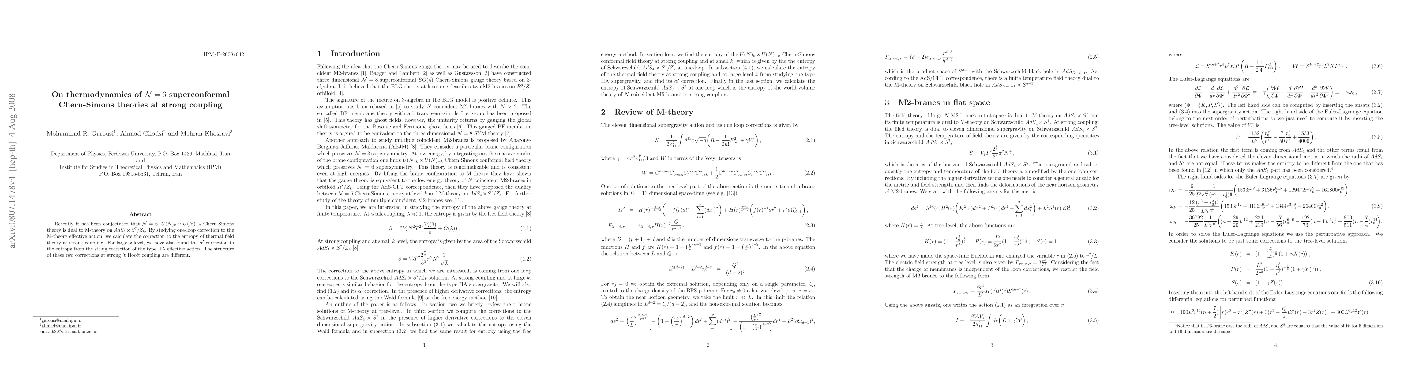 Researchers studied thermodynamics of N=6 superconformal Chern-Simons theories at strong coupling, finding corrections to the entropy of thermal field theory and type IIA effective action.