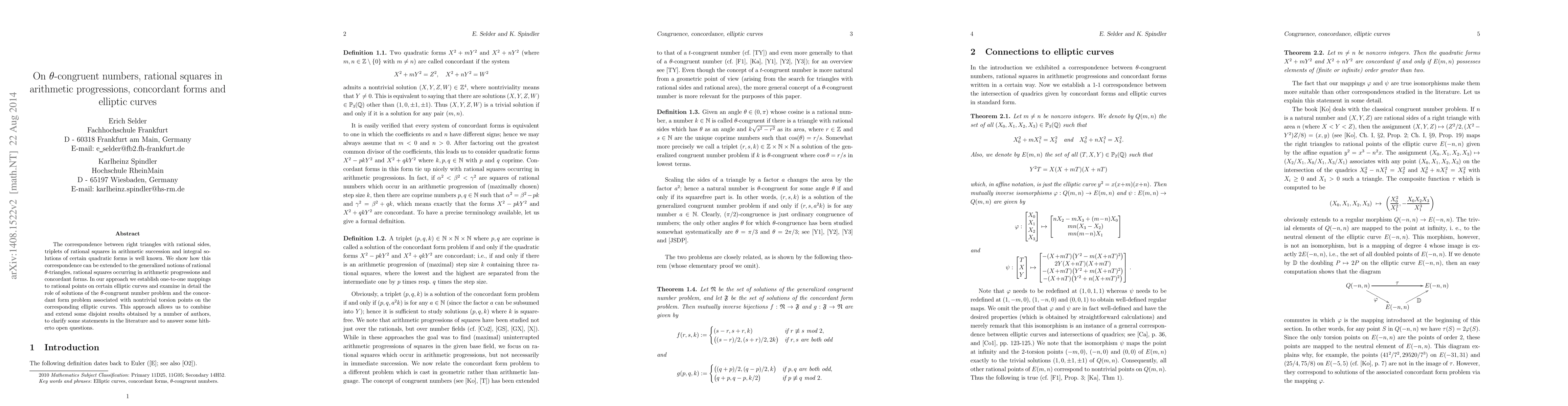 The correspondence between right triangles with rational sides, triplets of rational squares in arithmetic succession and integral solutions of certain quadratic forms is well known. We show how this correspondence can be extended to the generalized notions of rational $\theta$-triangles, rational squares occurring in arithmetic progressions and concordant forms. In our approach we establish one-to-one mappings to rational points on certain elliptic curves and examine in detail the role of solutions of the $\theta$-congruent number problem and the concordant form problem associated with nontrivial torsion points on the corresponding elliptic curves. This approach allows us to combine and extend some disjoint results obtained by a number of authors, to clarify some statements in the literature and to answer some hitherto open questions.