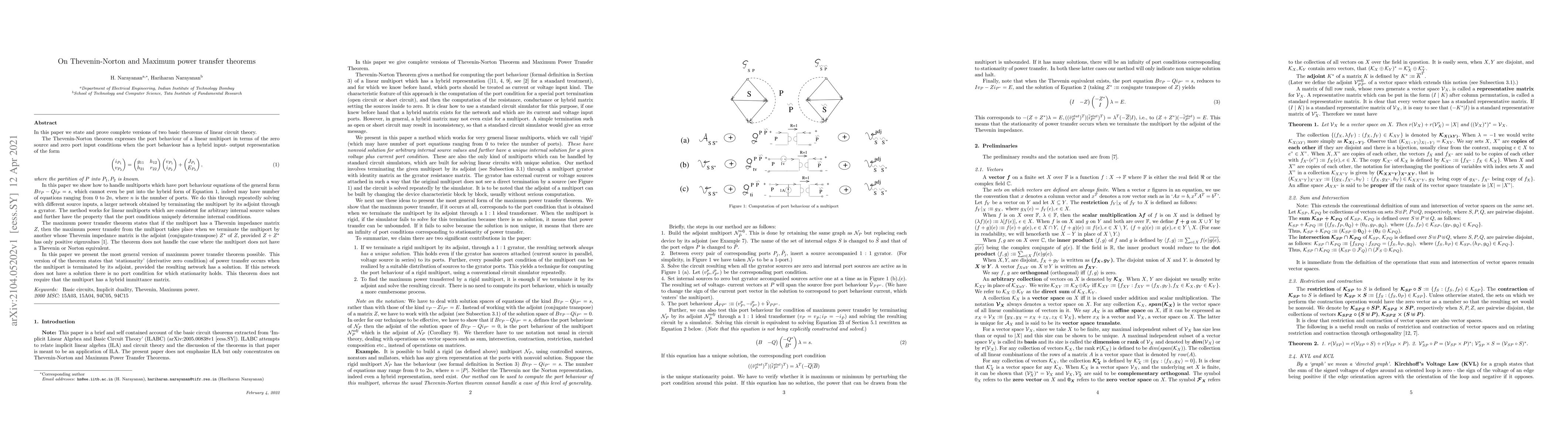 This paper explores the computation of port behavior for multiports using Thevenin-Norton transformations and presents a generalized maximum power transfer theorem applicable to linear multiports, even when they cannot be expressed in hybrid form. The method involves solving with different source inputs in a larger network and concludes that power transfer stationarity occurs when the multiport is terminated by its adjoint, provided the network has a solution.