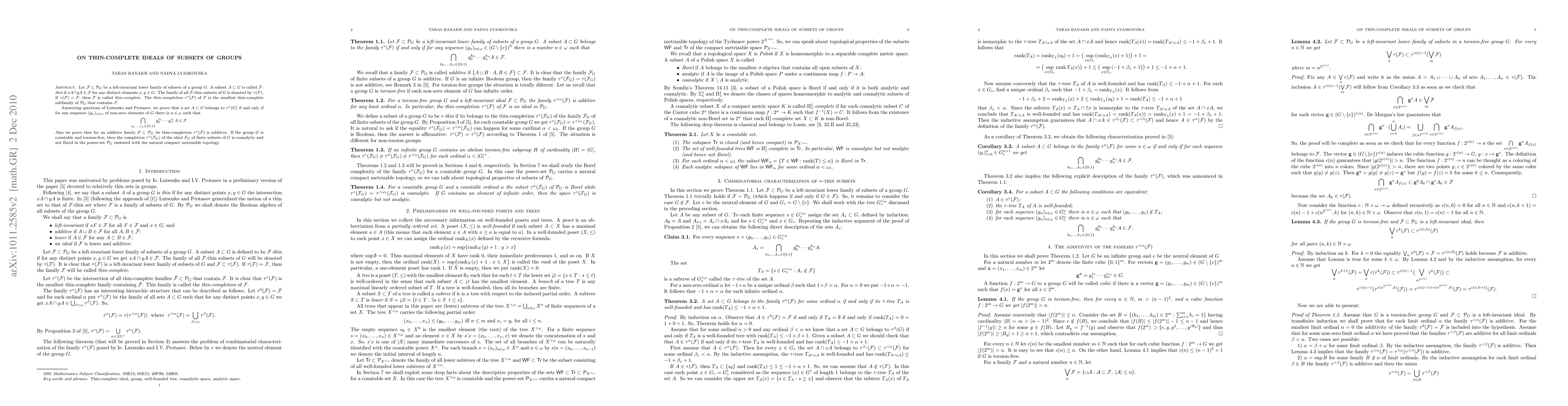 Given a family $F$ of subsets of a group $G$ we describe the structure of its thin-completion $\tau^*(F)$, which is the smallest thin-complete family that contains $I$. A family $F$ of subsets of $G$ is called thin-complete if each $F$-thin subset of $G$ belongs to $F$. A subset $A$ of $G$ is called $F$-thin if for any distinct points $x,y$ of $G$ the intersection $xA\cap yA$ belongs to the family $F$. We prove that the thin-completion of an ideal in an ideal. If $G$ is a countable non-torsion group, then the thin-completion $\tau^*(F_G)$ of the ideal $F_G$ of finite subsets of $G$ is coanalytic but not Borel in the power-set $P_G$ of $G$.