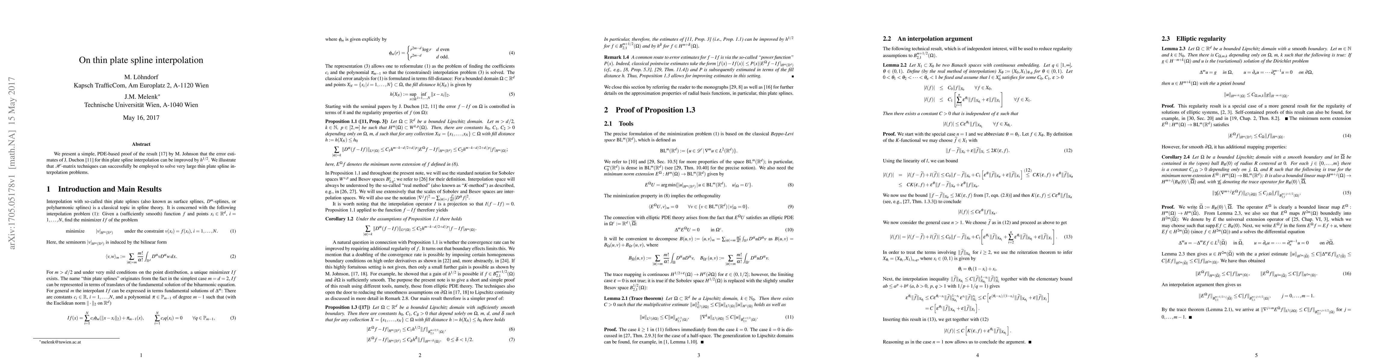 We present a simple, PDE-based proof of the result [M. Johnson, 2001] that the error estimates of [J. Duchon, 1978] for thin plate spline interpolation can be improved by $h^{1/2}$. We illustrate that ${\mathcal H}$-matrix techniques can successfully be employed to solve very large thin plate spline interpolation problems