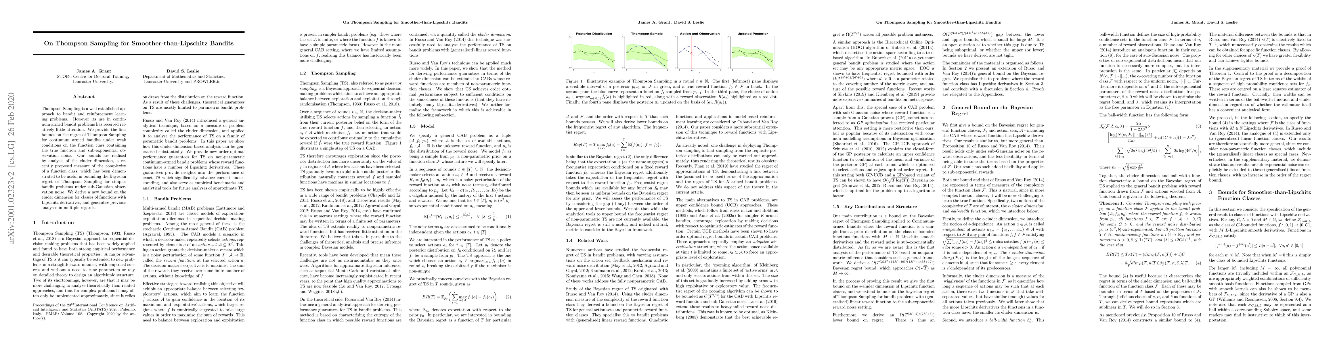 This paper establishes the first regret bounds for Thompson Sampling in continuum armed bandit problems under weak conditions on the function class and sub-exponential noise. It leverages the eluder dimension to generalize previous analyses and derive a new bound for classes of functions with Lipschitz derivatives.